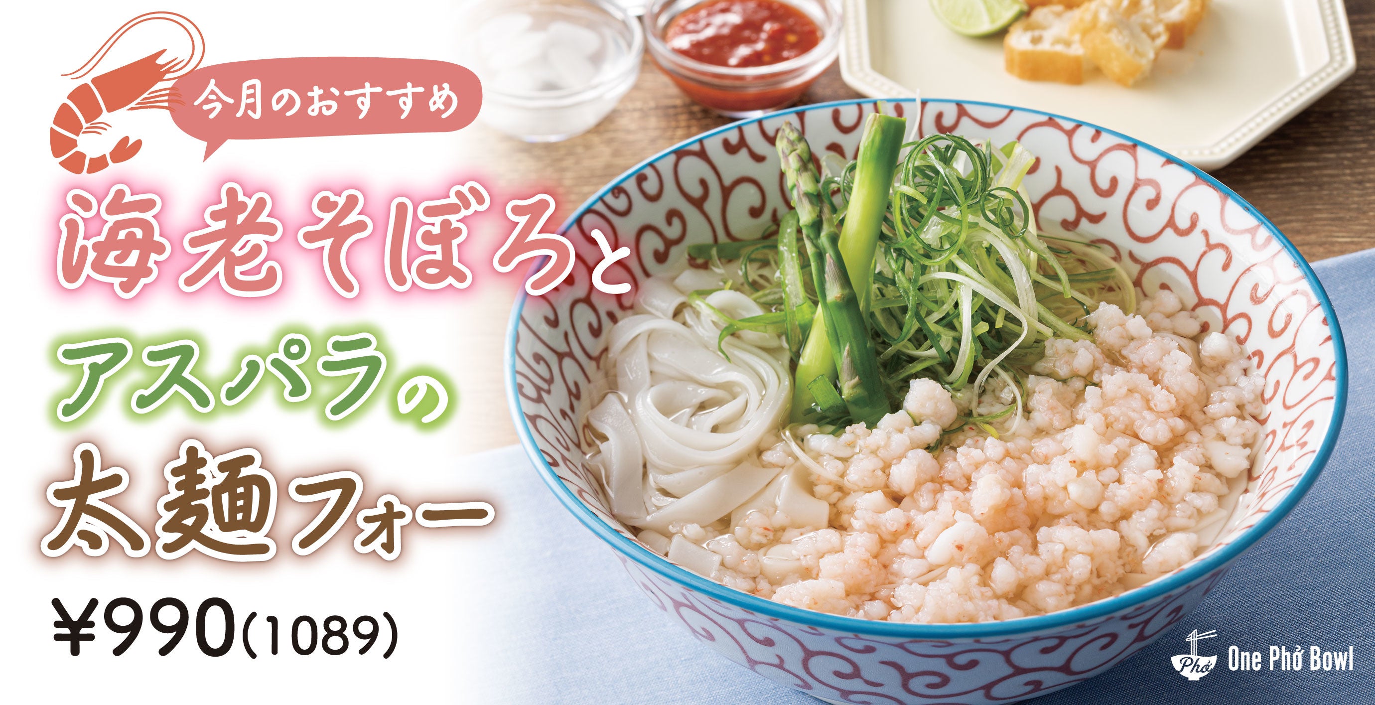 【ぷりっ&もっちり食感がたまらない!】フォー専門店「ワンフォーボウル」3月限定メニュー「海老そぼろとアスパラの太麺フォー」販売