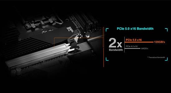 PCIe 5.0 設計により PCIe 4.0 の2倍の帯域幅をサポートし、今後数年間にリリースされる最先端の SSD や GPU の能力を最大限に発揮できるよう互換性を確保しています。