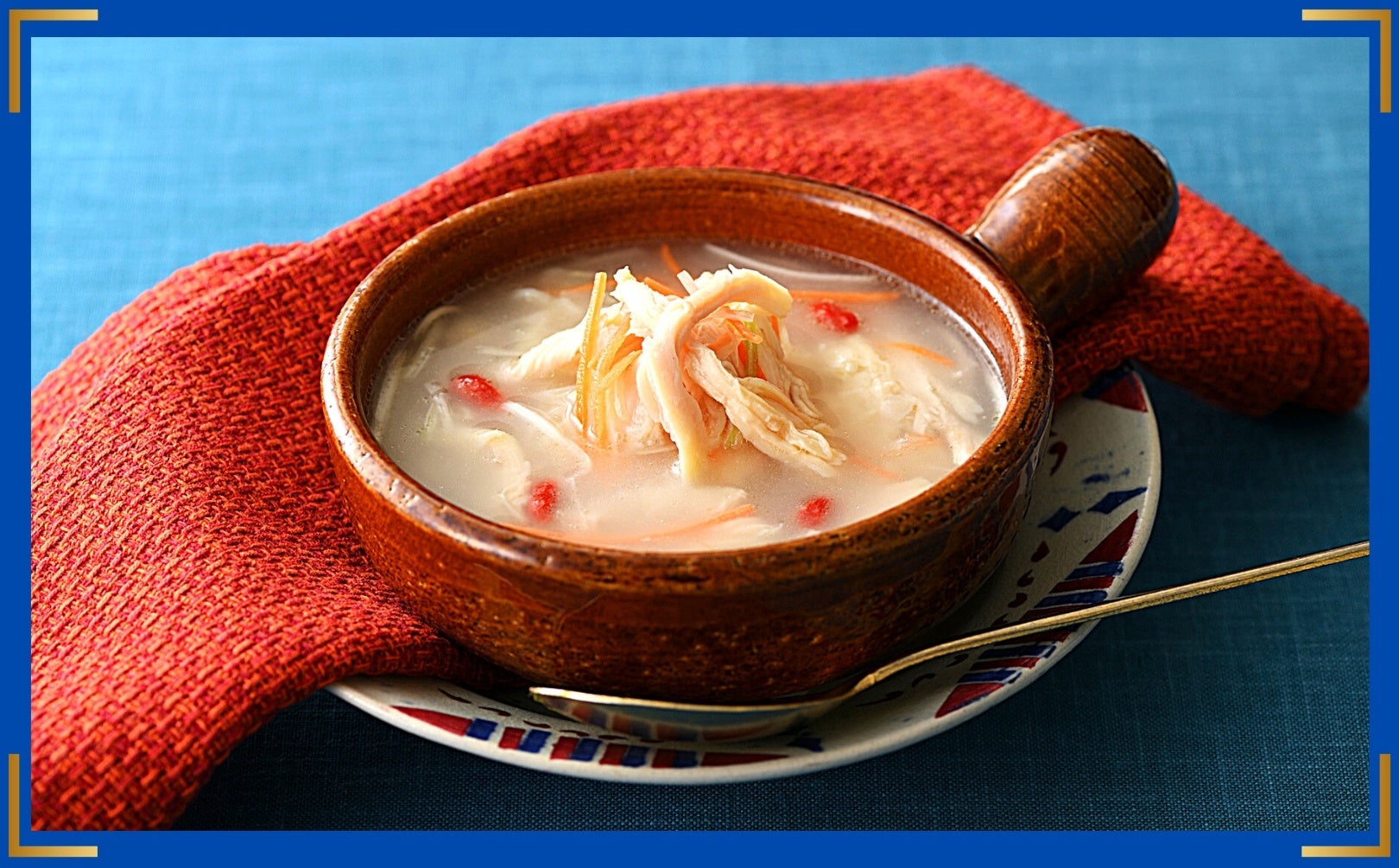 これからの寒い季節に食べたくなる『参鶏湯(サムゲタン)』は、もち麦などが入った、ほっこり温まる優しいスープ。
