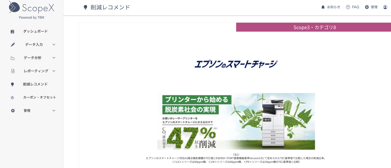 「ScopeX」は、CO2排出量の可視化から削減策のご提案までワンストップで実施できることが特長です。今回の協業により、「ScopeX」内で企業全体のCO2排出量を可視化し、さらにその削減策として、低消費電力で印刷が可能なエプソンのインクジェットプリンターのご提案まで行います。