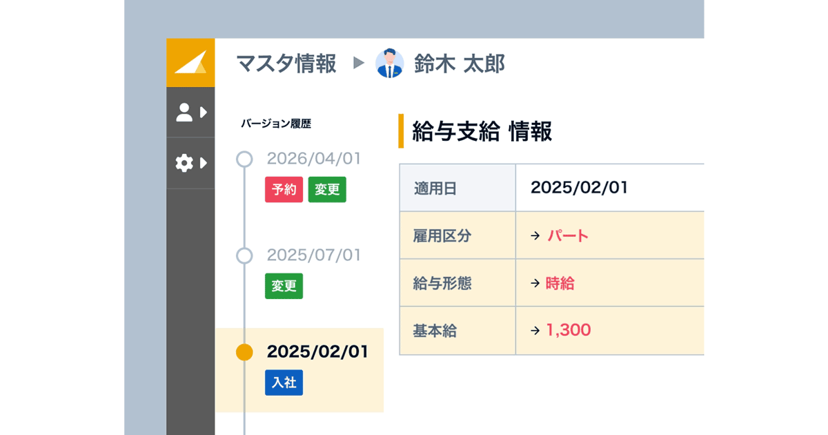 変更内容を事前に予約登録できるため、異動や昇給時の反映忘れを防止します。変更履歴も自動保存され、正確で安心なマスタ運用ができます。