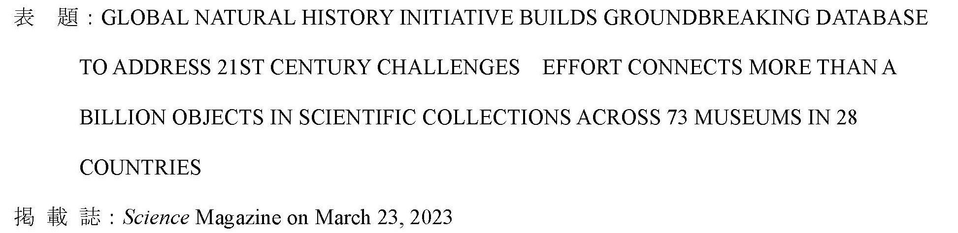 独立行政法人国立科学博物館(館長:篠田謙一)は、アメリカ・ワシントンDCのスミソニアン国立自然史博物館、ニューヨーク市のアメリカ自然史博物館そしてイギリスの大英自然史博物館が主導したグループに参加し、世界28カ国の国を代表する73の自然史博物館が保有するコレクションの内訳を調査して明らかにしました。