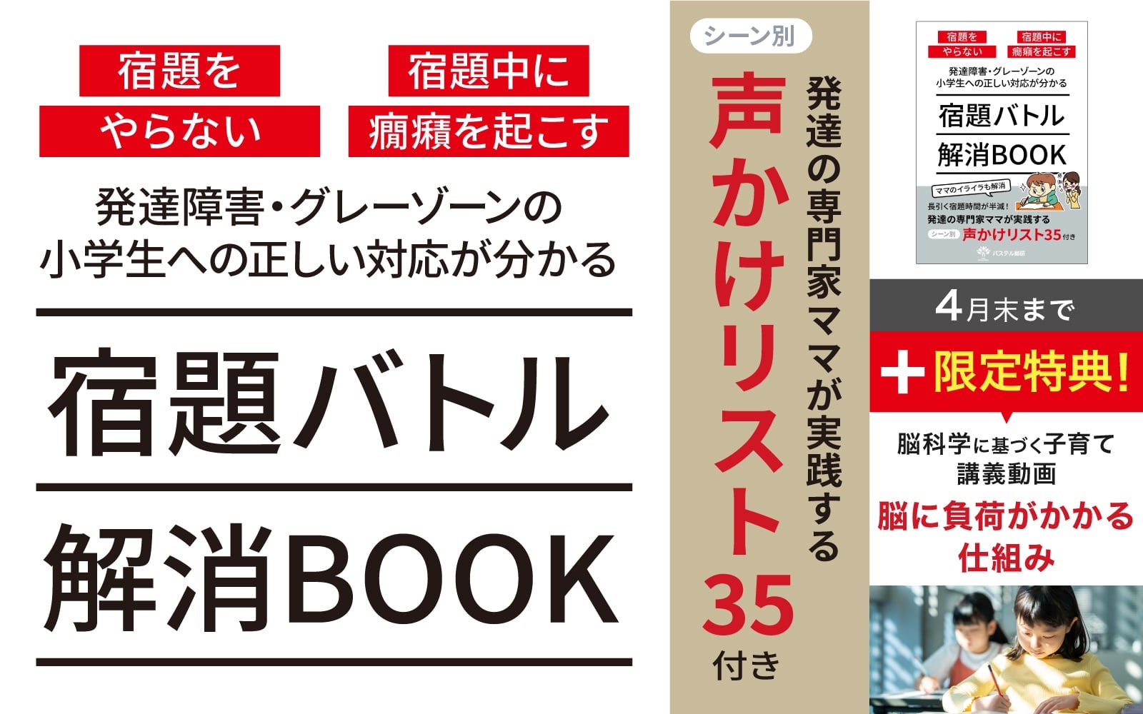 株式会社パステルコミュニケーション(本社:東京都豊島区、代表取締役吉野加容子)代表の吉野加容子が主宰する、発達グレーゾーンの困りごとを大人に持ち越さない、5年かかっても見つからなかった悩みの解決方法が5分で見つかるウェブサイト「パステル総研」よりリリースした『宿題をやらない 宿題中に癇癪を起こす 発達障害・グレーゾーンの小学生への正しい対応が分かる宿題バトル解消BOOK』に期間限定で、脳科学の視点から「宿題をしない理由」を深く理解できる特典動画もセットで再配布を開始しました。ダウンロードはこちらから< https://www.agentmail.jp/lp/r/11746/151273/>