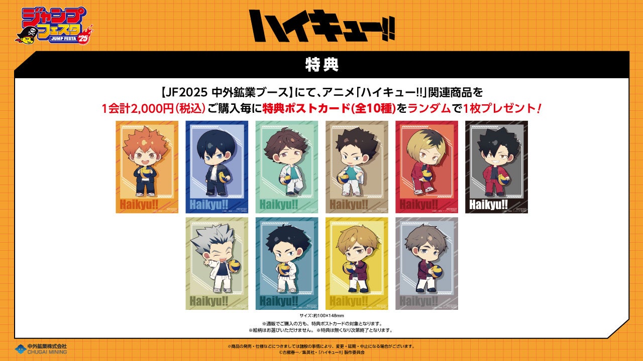 中外鉱業ブースにてアニメ「ハイキュー!!」JF2025関連商品を1会計2,000円(税込)ご購入毎に、特典ポストカード(全10種)をランダムで1枚プレゼントします。