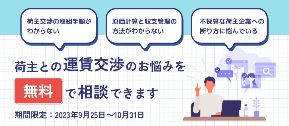 「荷主交渉の取り組み手順がわからない」「原価計算と収支管理の方法がわからない」など、お悩みの運送・物流企業を対象に、無料個別相談会を、2023年10月末までの期間限定で実施しています。