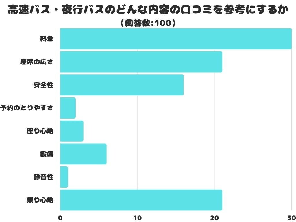 高速バス・夜行バスのどんな内容の口コミを参考にするかをアンケートにて調査したところ、1位は「料金」でした。