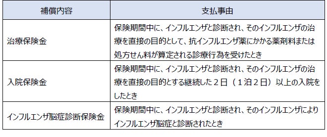 本保険は、保険期間中にインフルエンザに罹患して治療や入院をした場合に加えて、インフルエンザ脳症と診断された場合にも保険金を受け取ることができるため、インフルエンザに関するリスクに広く備えることが可能です。