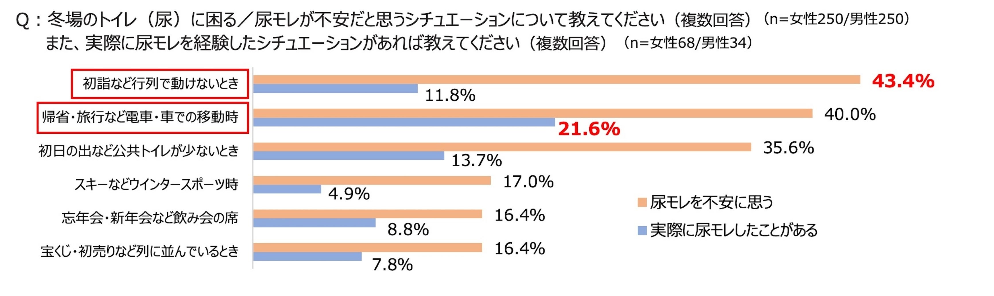 冬場のトイレ(尿)に困る/尿モレが不安だと思うシチュエーション:1位は「初詣の行列」43.4%