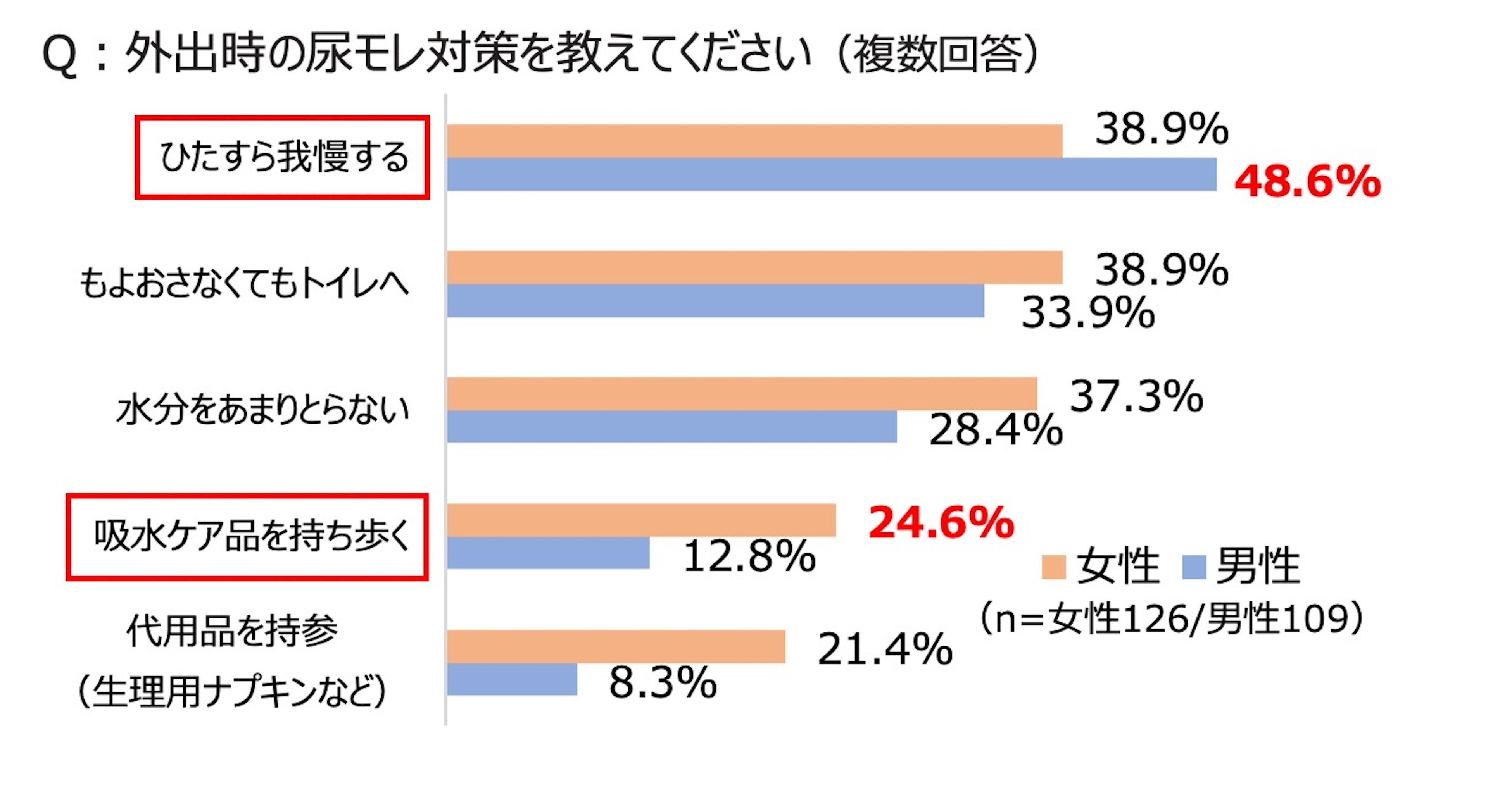 外出時の尿モレ対策 1位「ひたすら我慢」、2位「もよおさなくてもトイレへ」、3位「水分をとらない」