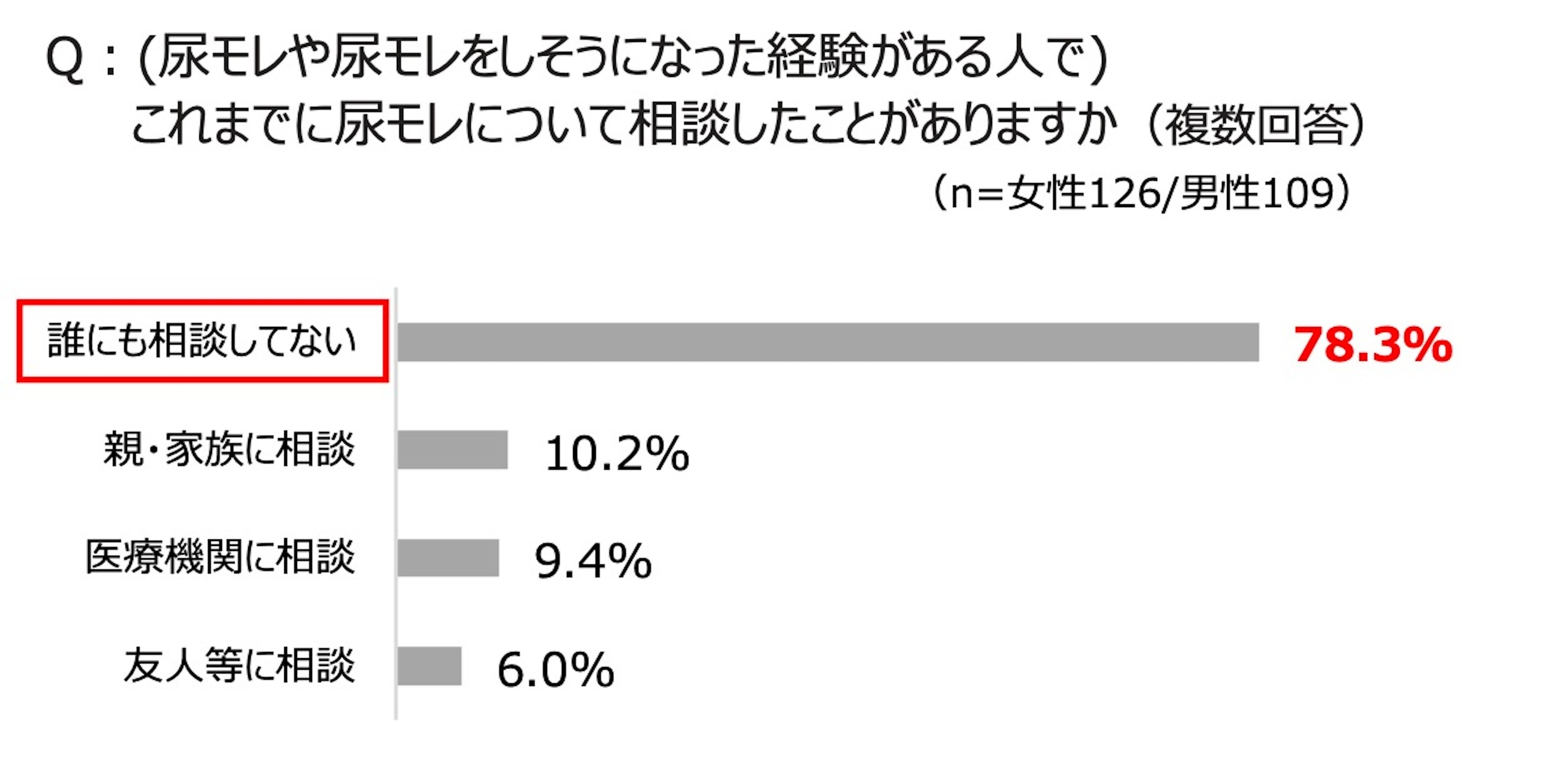 ◎尿モレやヒヤリ経験がある方の約8割(78.3%)が「尿モレを誰にも相談していない」という実態が明らかに。
