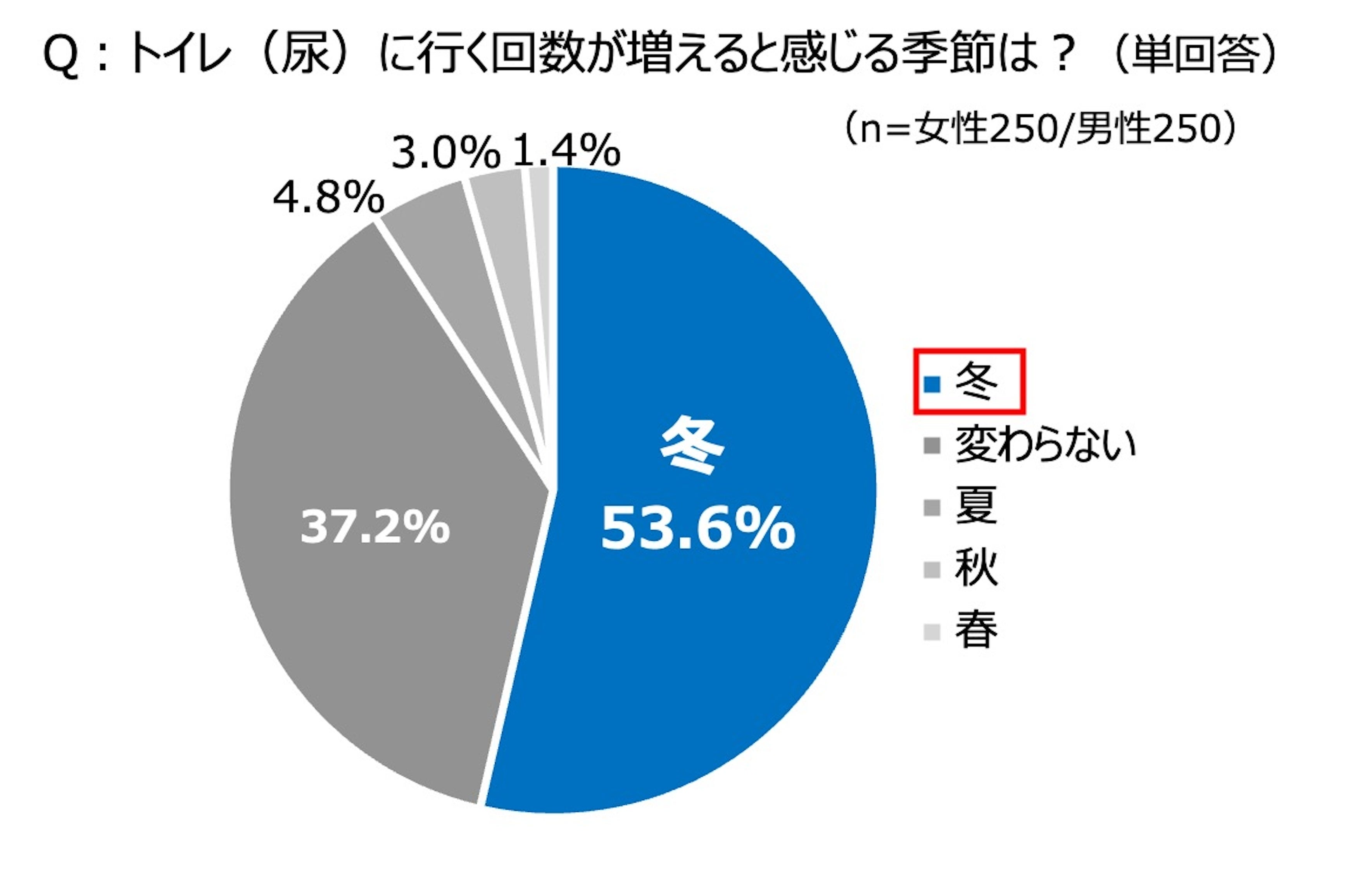 ◎当社が全国20〜60代500名を対象に行った「尿トラブル」に関するアンケート調査(WEB調査:2023年10月25日-27日)では、「トイレ(尿)に行く回数が増えると感じる季節は?」という質問に、全体の過半数53.6%が「冬」と回答。