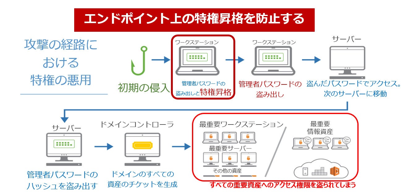 これにより、権限昇格と認証情報の漏えいによる水平移動、垂直移動や攻撃用ツールの導入を防ぐことができるため、例え端末経由で侵入されたとしても攻撃者は有効な施策を打つことが非常に難しくなり、報道されるような大きな被害の発生を防ぐことが可能となります。