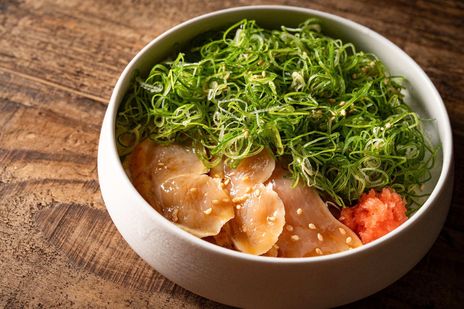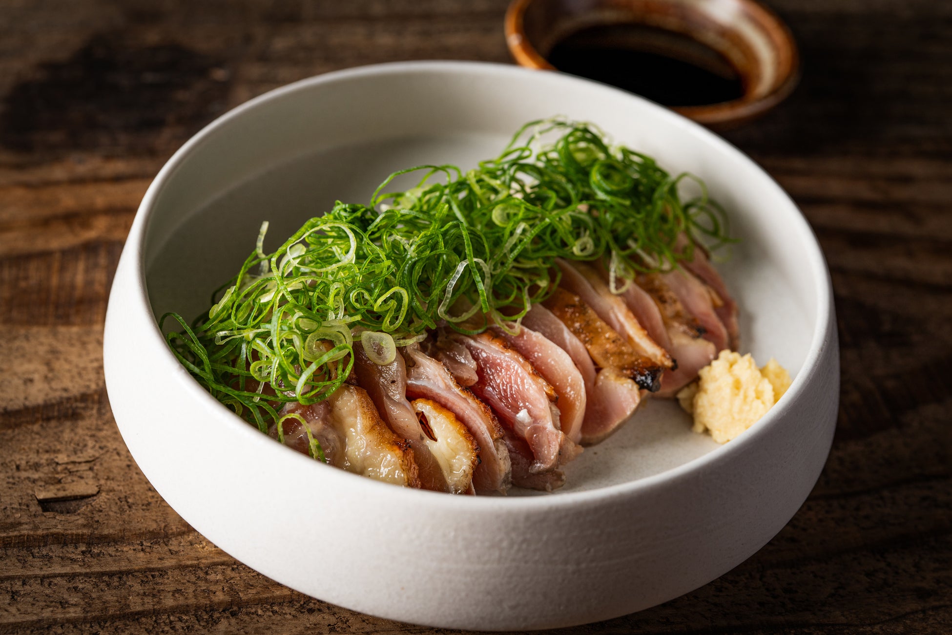 地鶏のむね肉を使用した<地鶏たたき葱まみれ>。これまで、<日向夏ポン酢>と<季節の味わい>の2種類でご用意していましたが、今回新たに甘みとコクのある九州醤油「マルタニ醤油」を使った<マルタニ生姜醤油>が新登場。