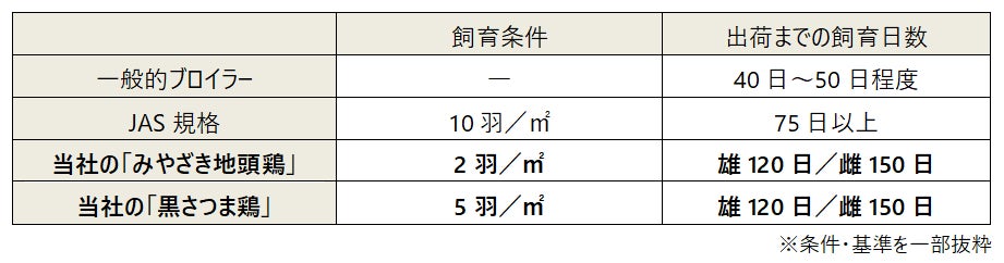 食鳥には、ブロイラー・銘柄鶏(こだわり育成のブロイラー)・地鶏の区分があり、地鶏は日本農林規格により生産方法の基準が設けられています。当社の地鶏は、その基準をさらに上回る条件で育成していることに加え、各々の農家がおいしさを追求し研究、研鑽。プライドとこだわりを持って育成しています。