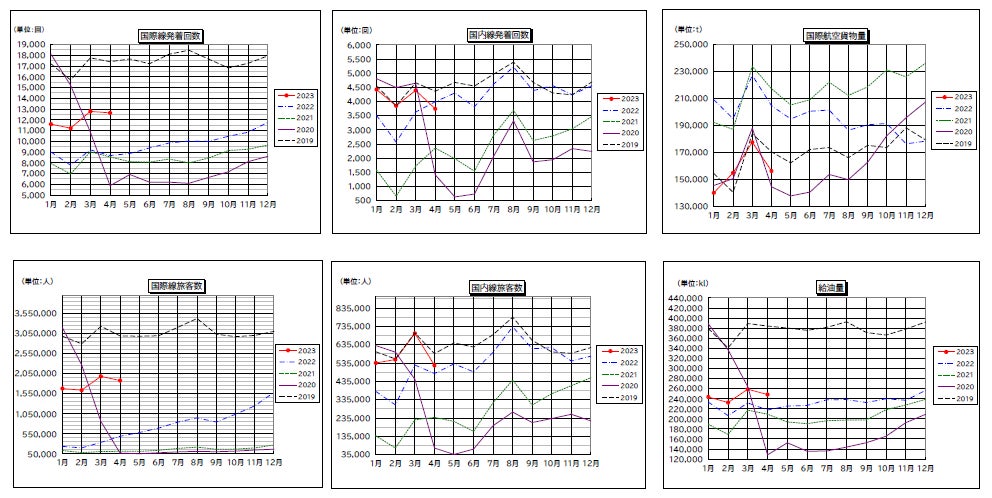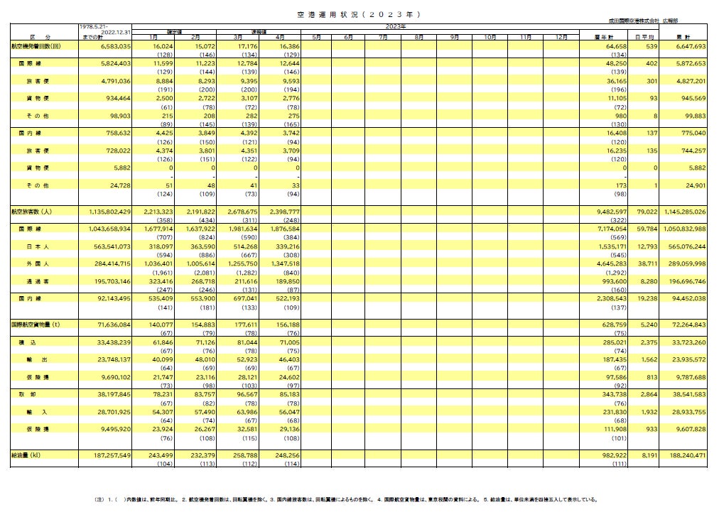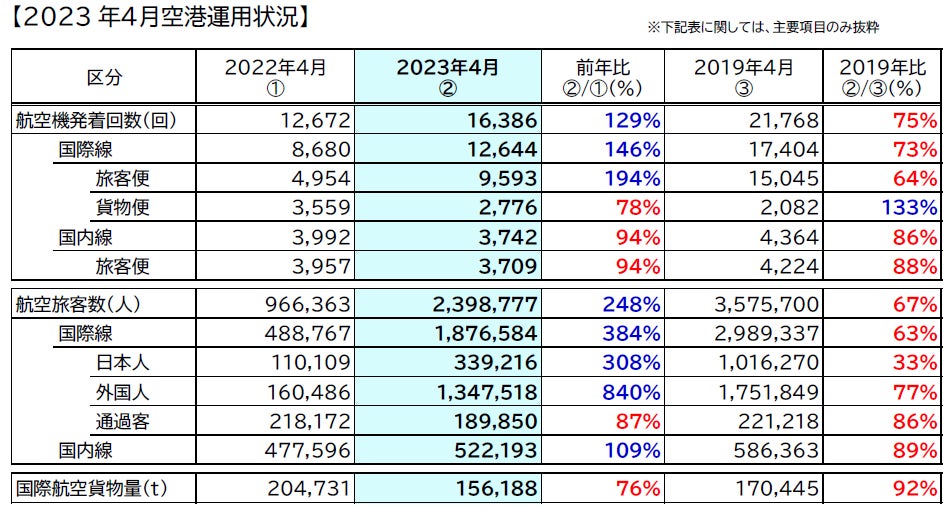 2023年4月 空港運用状況 国際線旅客便数及び外国人旅客数が引き続き好調に推移。外国人旅客数は前年同月比840%の135万人に。
