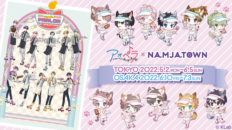 コラボ限定オリジナルイラストは、「ナンジャタウン」のシンボル「猫」にちなんだ衣装を身にまとった生徒たちが、フルーツパーラーのスタッフになっておもてなしする姿が描かれています。東京の池袋では5月に、大阪の梅田では6月にスタートを予定しています。
