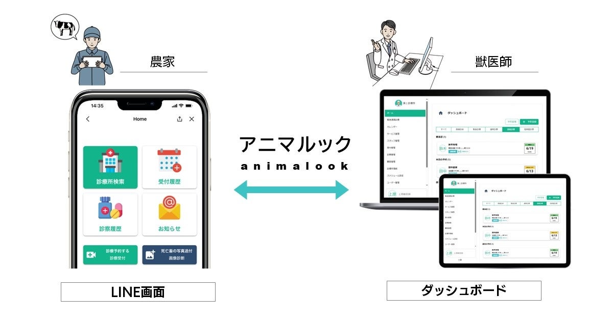 アニマルックは、獣医師が遠隔診療を行う際に必要なビデオ通話や、診療の予約・管理ができるサービスです。遠隔診療によって獣医師の業務効率の向上を図るとともに、農場への外部関係者立ち入りを遠隔診療で最小限にすることで、感染リスクを最小化します。また、ITが苦手な方でも直感的に利用できるアプリケーションのLINEを用いて本サービスを利用でき、獣医師と農業者の新たなコミュニケーション手段としても有効なツールだと考えています。