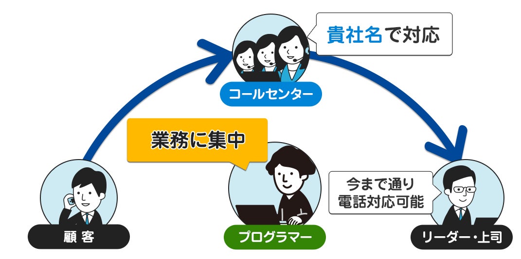 バルテックが電話一次対応。これまでプログラマーが行っていたリーダー・上司への取次ぎを当社が代行します。