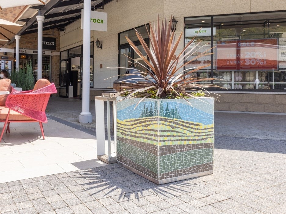タイルアートプランターの素材には、環境配慮型の素材等のサステナビリティを意識したリサイクル素材を活用しました。セラミックやタイルを使った装飾は、彩り豊かで表現の幅が広く、佐賀らしさや地域の魅力を表現しながら、スパニッシュ・コロニアルをイメージした鳥栖プレミアム・アウトレットのさわやかで明るい空間に調和させています。