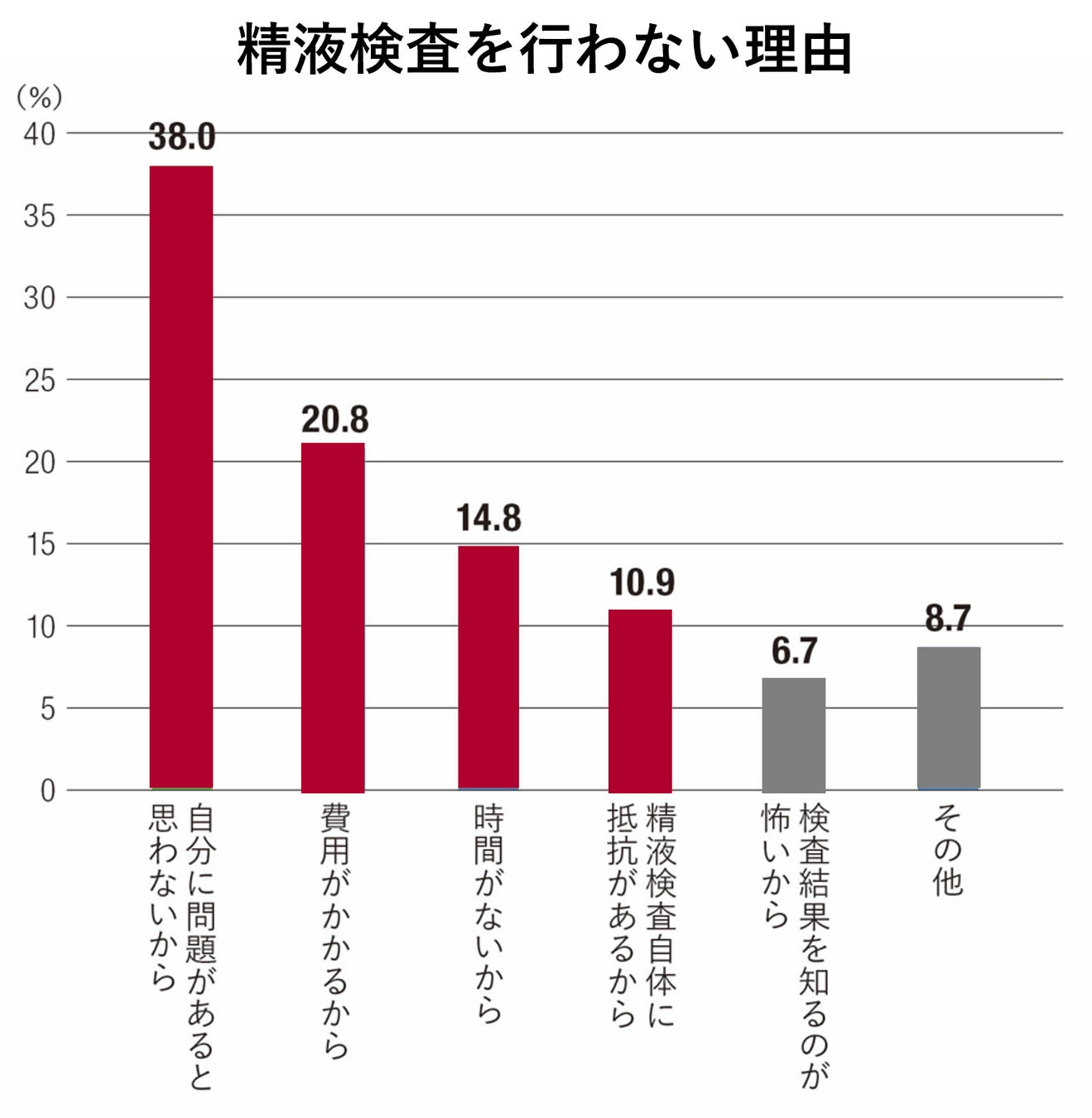 しかし、精液検査をしない理由を調査したところ、「自分に問題があると思わない」という回答が38%と最も多く、「費用」や「時間」、「検査自体への抵抗」といった回答が続きました。「自分はきっと大丈夫」「まさか自分はならないだろう」「わざわざクリニックへ行くのが面倒だ」と自分ゴト化できない男性が非常に多く、医療機関での精液検査でハードルが高いことが考えられます。しかし、クリニックに行かずとも自身で完結できる従来の簡易的な精子検査キットは、検査できる項目が少ないため、WHOが定める項目数を満たしておらず、精密な検査が叶いません。