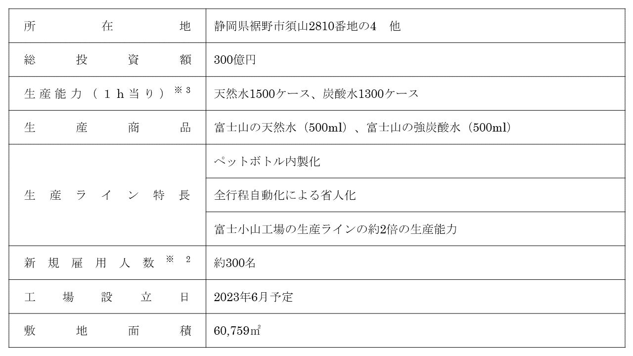 また、富士裾野工場の敷地内に平置きの物流倉庫を新設することで、物流・保管能力を強化し、災害時でも飲料水などの物資を迅速かつ円滑に提供できる体制を構築します。当工場の取得と稼働に伴い、静岡県内で約300名(※2)を優先採用するとともに、同県に移住して当工場に勤務する従業員に対しては、引越し費用の補助等の支援を行います。