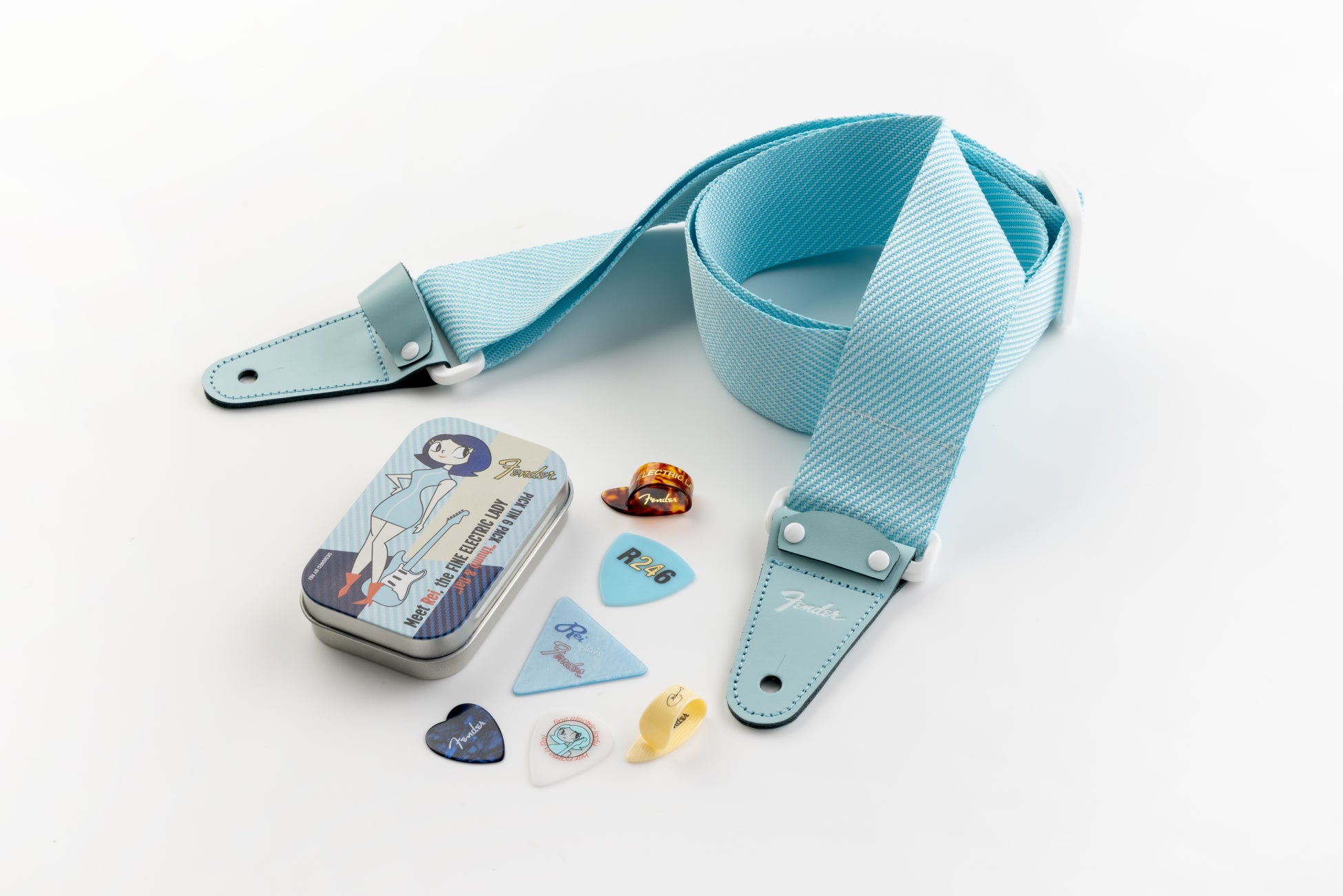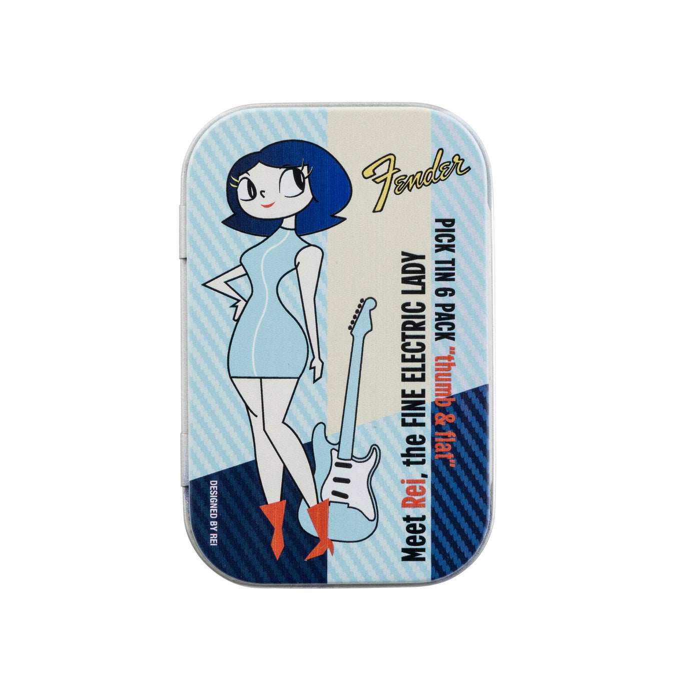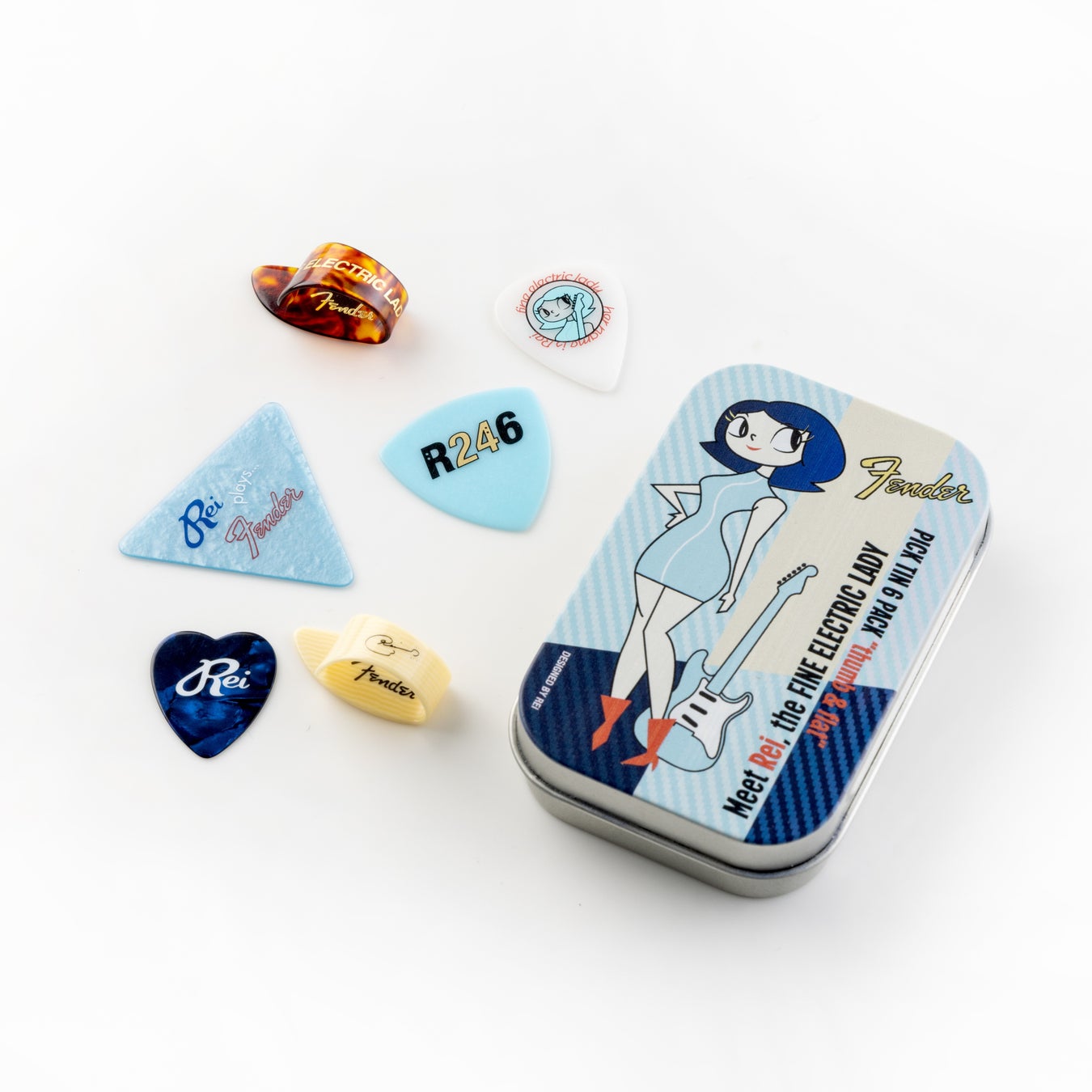 『Rei Signature Picks』は、Reiの多彩なプレイスタイルに対応する6種類のピックがセットになったピック缶です。フラットピック4種とサムピック2種が、Rei本人がデザインしたキュートなケースに収められています。ケースには、かつてFenderの広告に採用されたキャッチコピー“FINE ELECTRIC INSTRUMENTS”をオマージュした、“FINE ELECTRIC LADY”のロゴがあしらわれており、Fender愛が詰まった遊び心あるデザインになっています。こちらの製品は、Fender Flagship TokyoおよびFender公式オンラインショップでの限定販売となります。