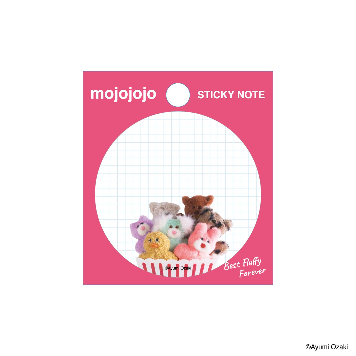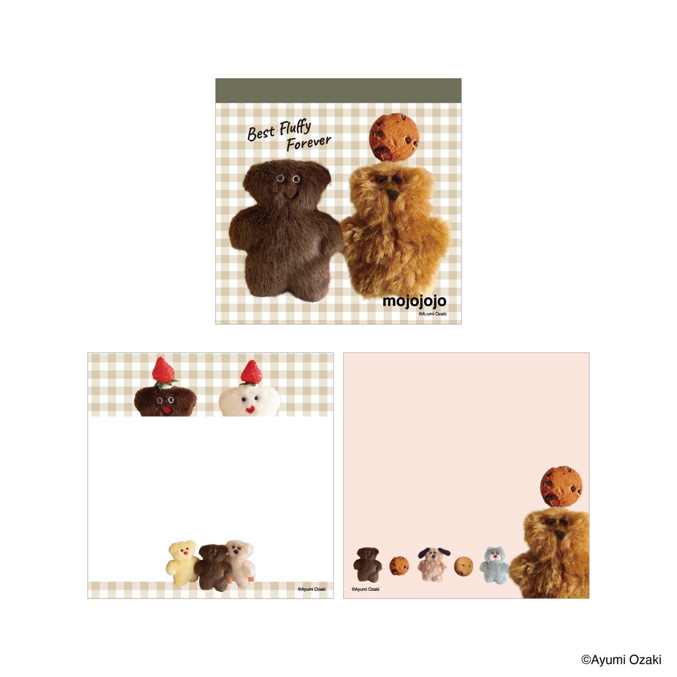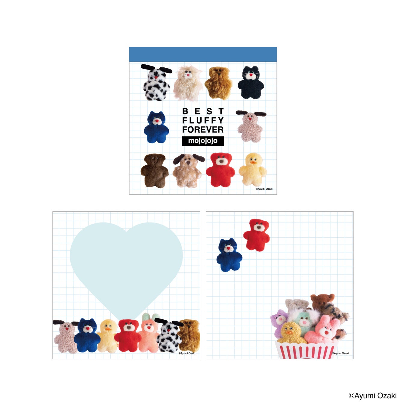 今回新発売するステーショナリーは、スクエアメモ、付箋、B6リングノート、ブックマーカー、ダイカットステッカー、アクリルクリップ、アクリルキーホルダー、ランチトートの8アイテム(全28種)です。「mojojojo」作品の中でも人気が高い定番のぬいぐるみをデザインし、「mojojojoらしさ」のある明るいカラーに仕上げました。