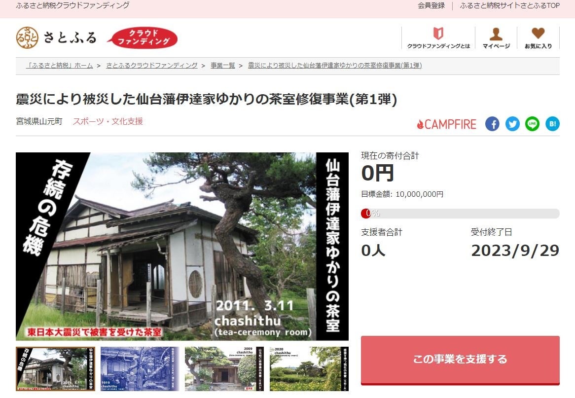 宮城県山元町とさとふる、被災した仙台藩伊達家ゆかりの茶室を修復するため、寄付受け付けを開始