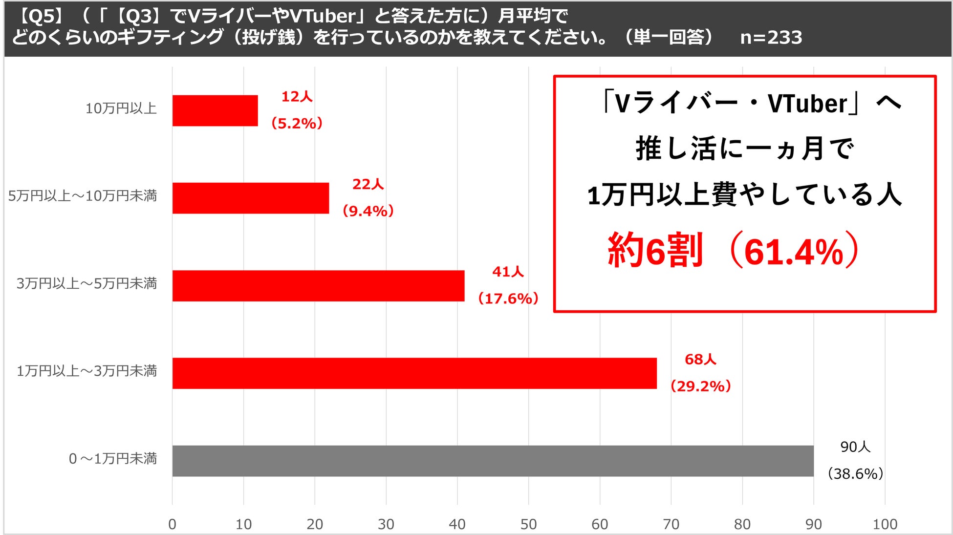 「月平均でどのくらいの金額を費やしているかを教えてください。」という質問に対して、「推し活をしている」と回答した人のうち最も多かった回答が、31.9%で「1万円以上~3 万円未満」となりました。2 位は 28.1%で「0~1 万円未満」、3 位は15.8%で「3 万~5 万」という結果になり、日本経済全体が物価高の傾向にある中で、推し活をしている人のうち約 7 割が 1ヵ月で 1 万円以上推し活に費やしていることがわかりました。また、「V ライバーや VTuber」を推している人の約 6 割(61.4%)がギフティング(投げ銭)に 1 万円以上を費やしており、「V ライバー・VTuber」市場の人気・盛り上がりは依然継続しているものと見ることができます。