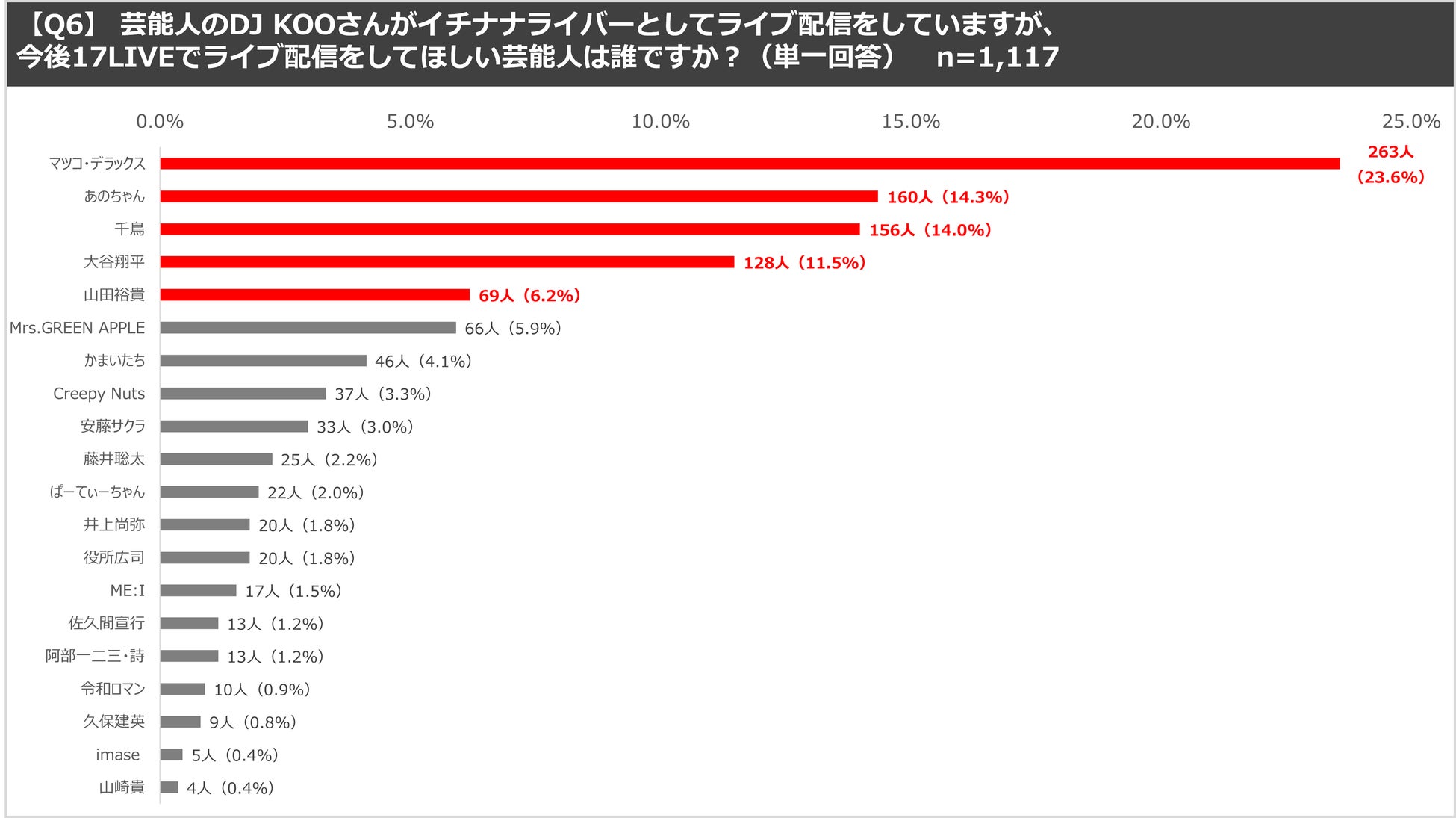 今後「17LIVE」でライブ配信をして欲しい芸能人 No.1 は、全体投票数の 23.6%を獲得した、マツコ・デラックスさんが選ばれ、2022年に実施したユーザー調査に続いて 2 回連続の 1 位に輝きました。2 位にあのちゃん、3 位に千鳥さん、4 位に大谷翔平さん、5 位に山田裕貴さんが選ばれました。上位にランクインしている方は、テレビへの出演数が多い方や歴史的偉業を成し遂げているスポーツ選手、最も話題を集めた俳優など、今年話題の著名人が多くの支持を集める結果となりました。