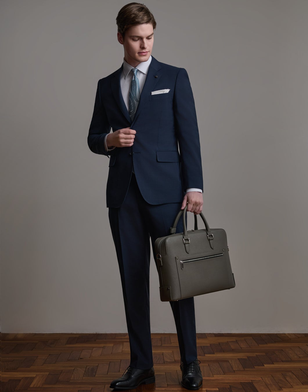 ポケット裏地チーフ仕様や、上着内ポケットにブランドカラーのロイヤルブルー・ストライプ生地を使うなどディテールにこだわった特別仕様のスーツ。