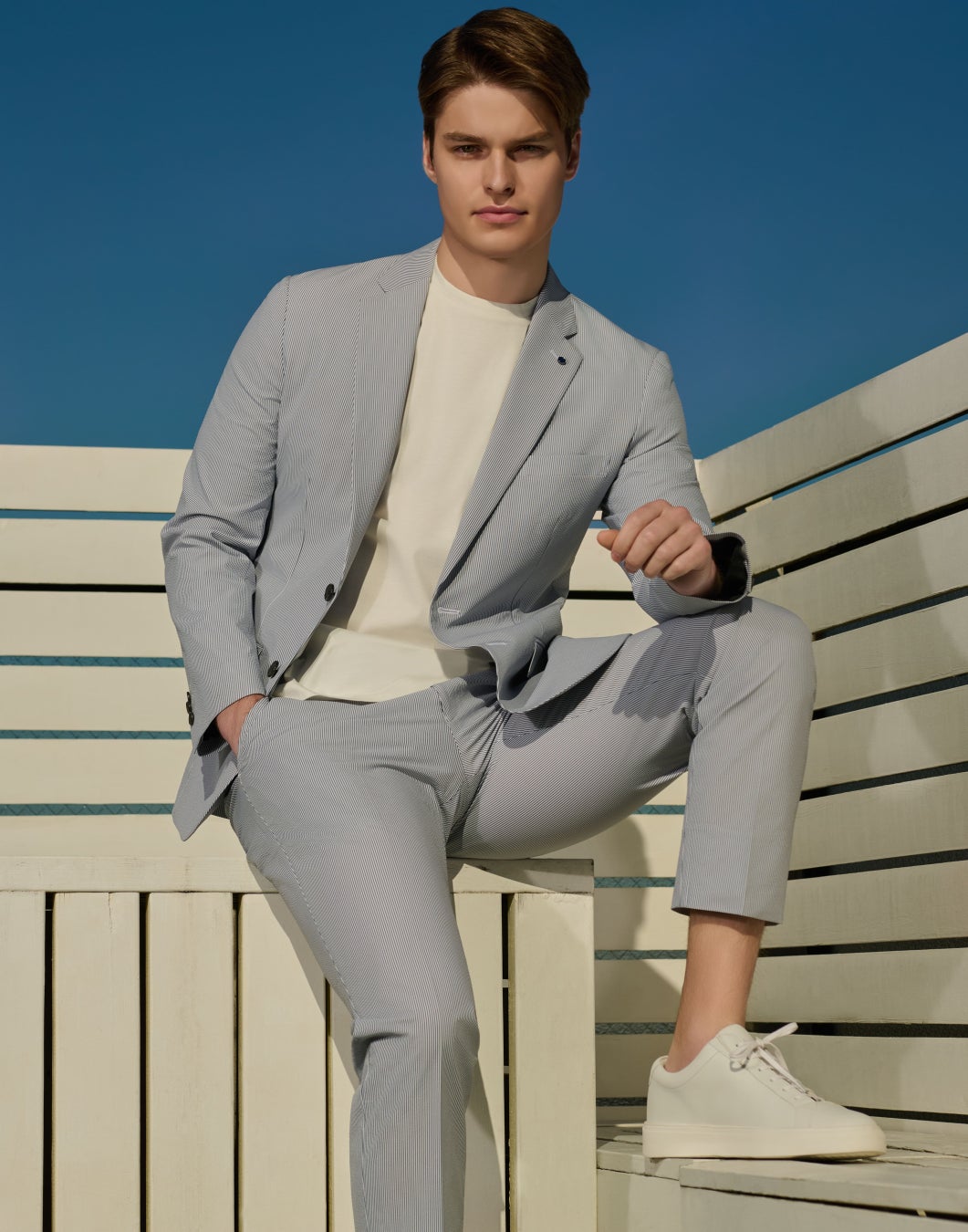 速乾性が高く軽量で、ベタつきづらいシアサッカー(しじら織り)素材を使用した春夏向きの環境に優しいセットアップ。