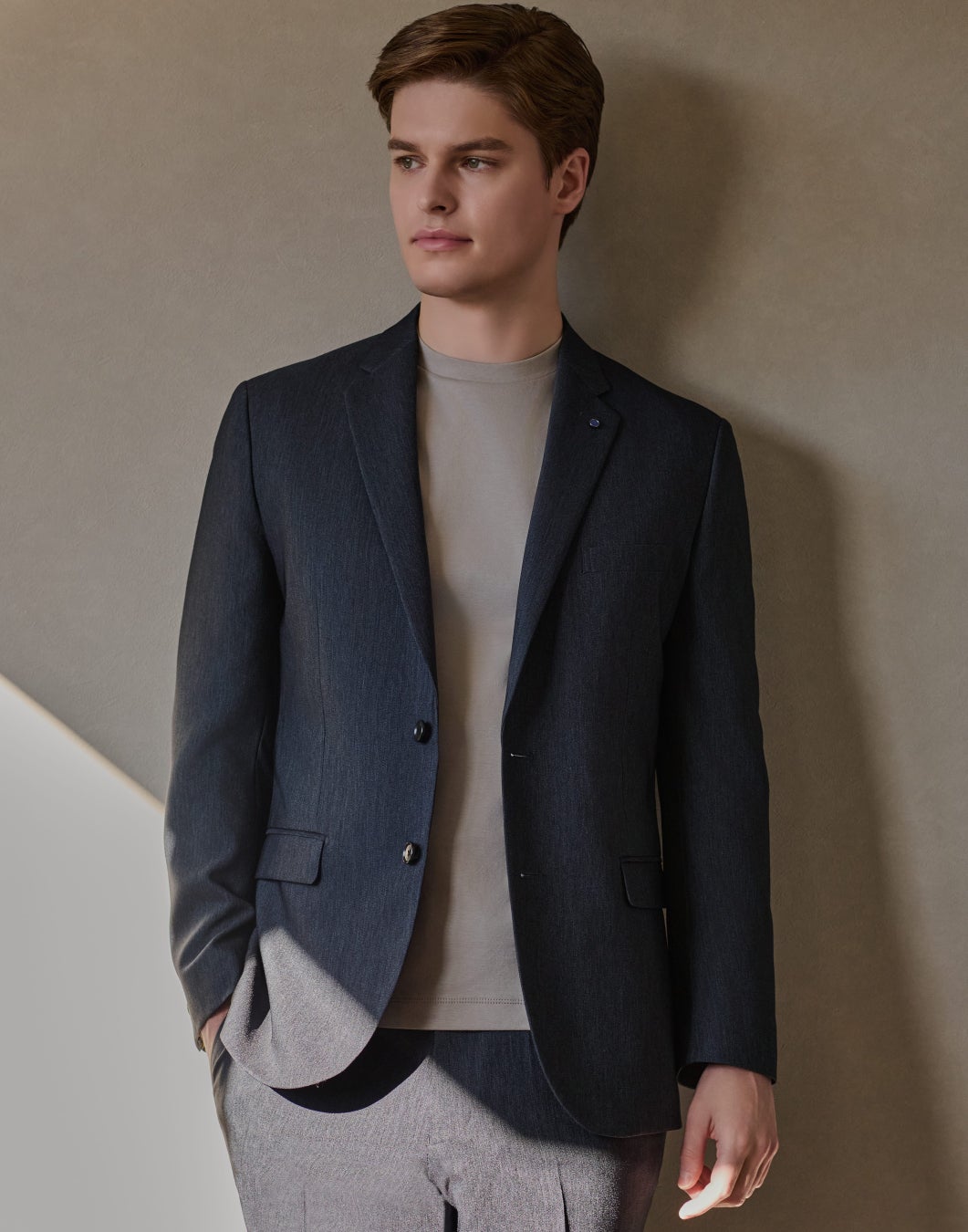 ウォッシュ感のあるデニム調に染めたリサイクルポリエステル混紡素材を使用した、ほどよいカジュアル感と環境への考慮を両立したセットアップ。