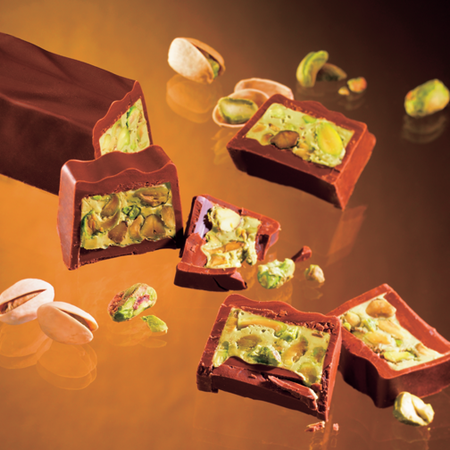香ばしくコク豊かなピスタチオクリームに、深煎りしたピスタチオと塩がけしたピスタチオの2種類を混ぜ込んで、まろやかなミルクチョコレートに閉じ込めました。 切り分けると、なめらかなピスタチオクリームとたっぷり入ったピスタチオが表情豊かに顔をのぞかせます。 好きな厚さに切り分けて食べるスタイルが楽しいチョコレートです。