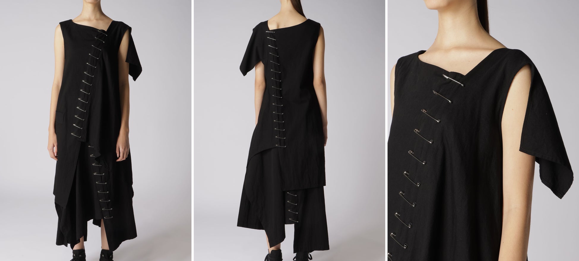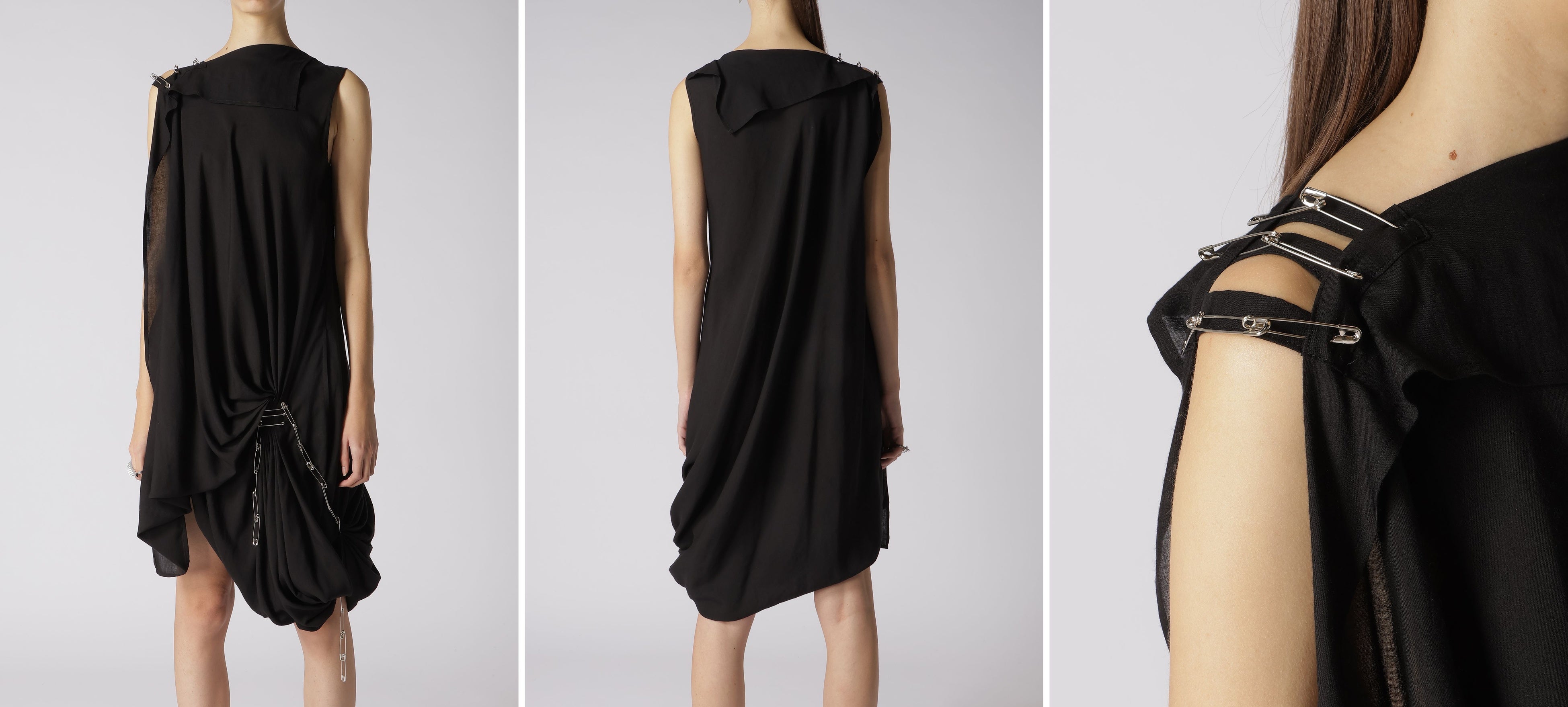 ドレープ、右肩にセーフティピンのアクセント、変型ボートネック、左脇にシームポケット