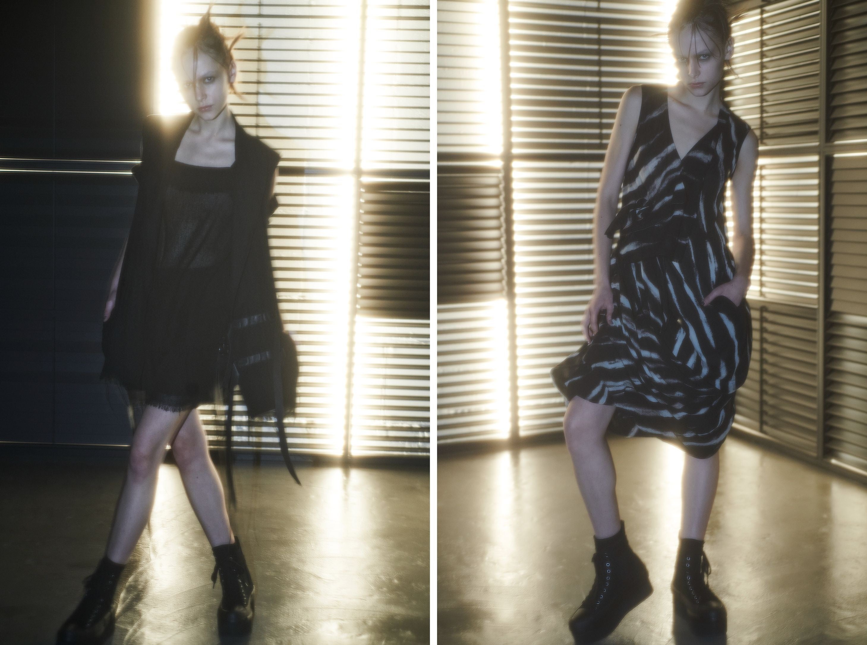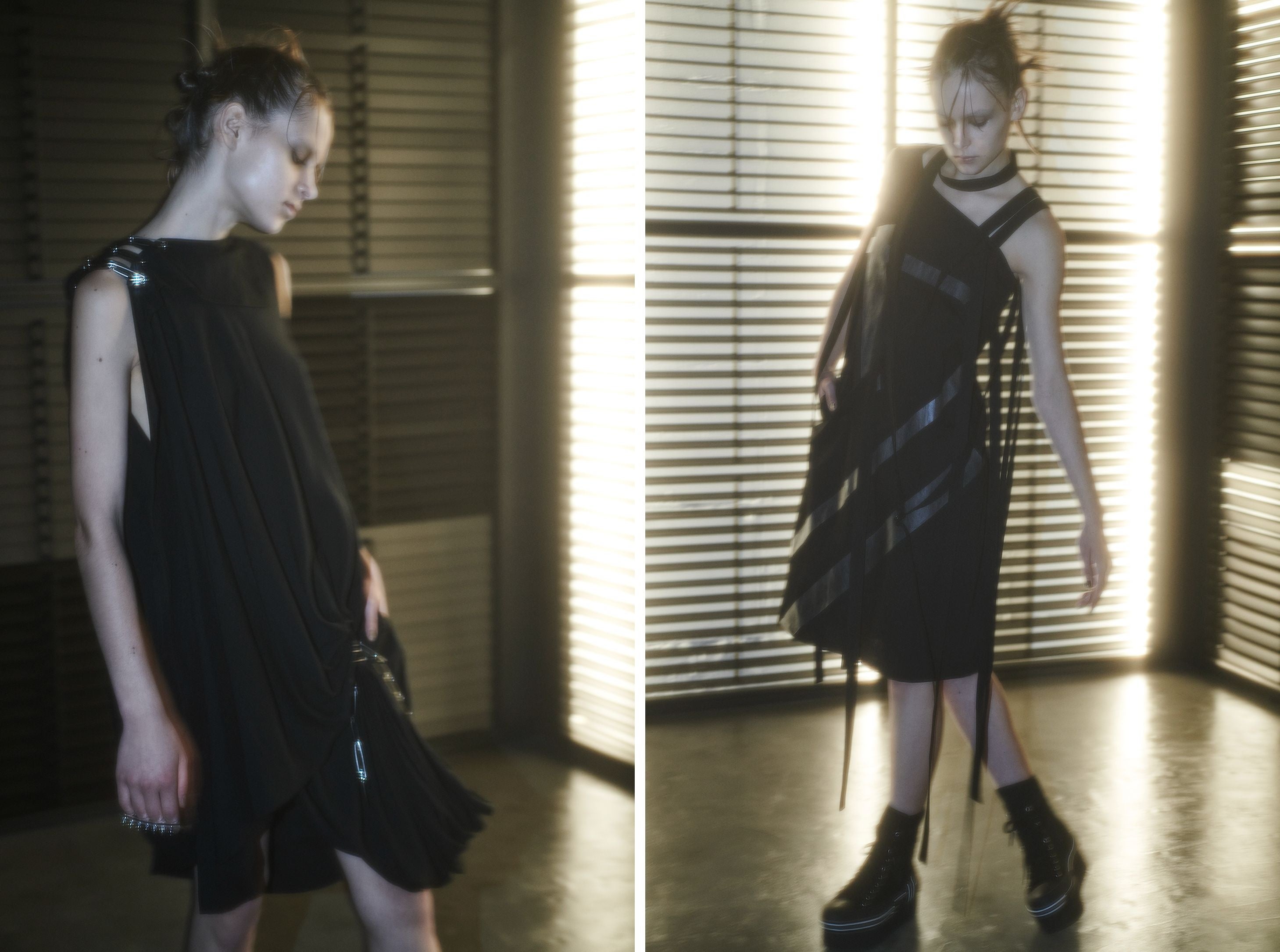 セットアップやプリミティブなストライプとバルーンドレープがアクセントを添えるワンピースなど、コントラストを