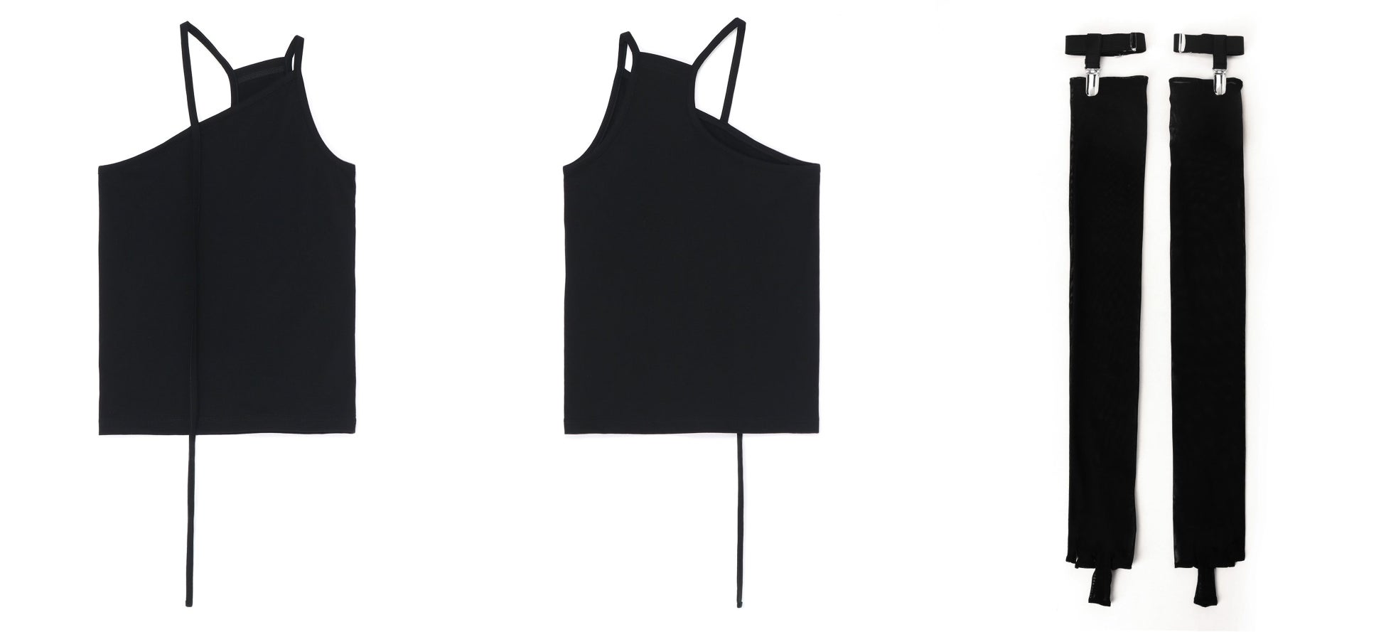 アシンメトリー・キャミソール13,200 yen ガータークリップ付きロンググローブ 28,600 yen