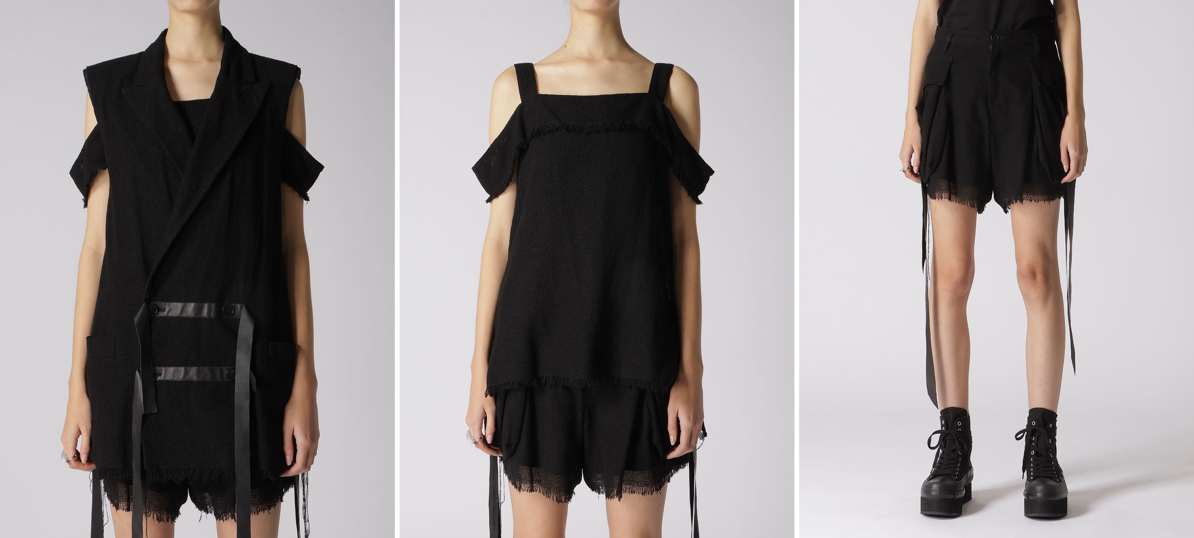 ダブルブレスト・ロングジレ 85,800 yen ショルダーストラップ・ブラウス 41,800 yen