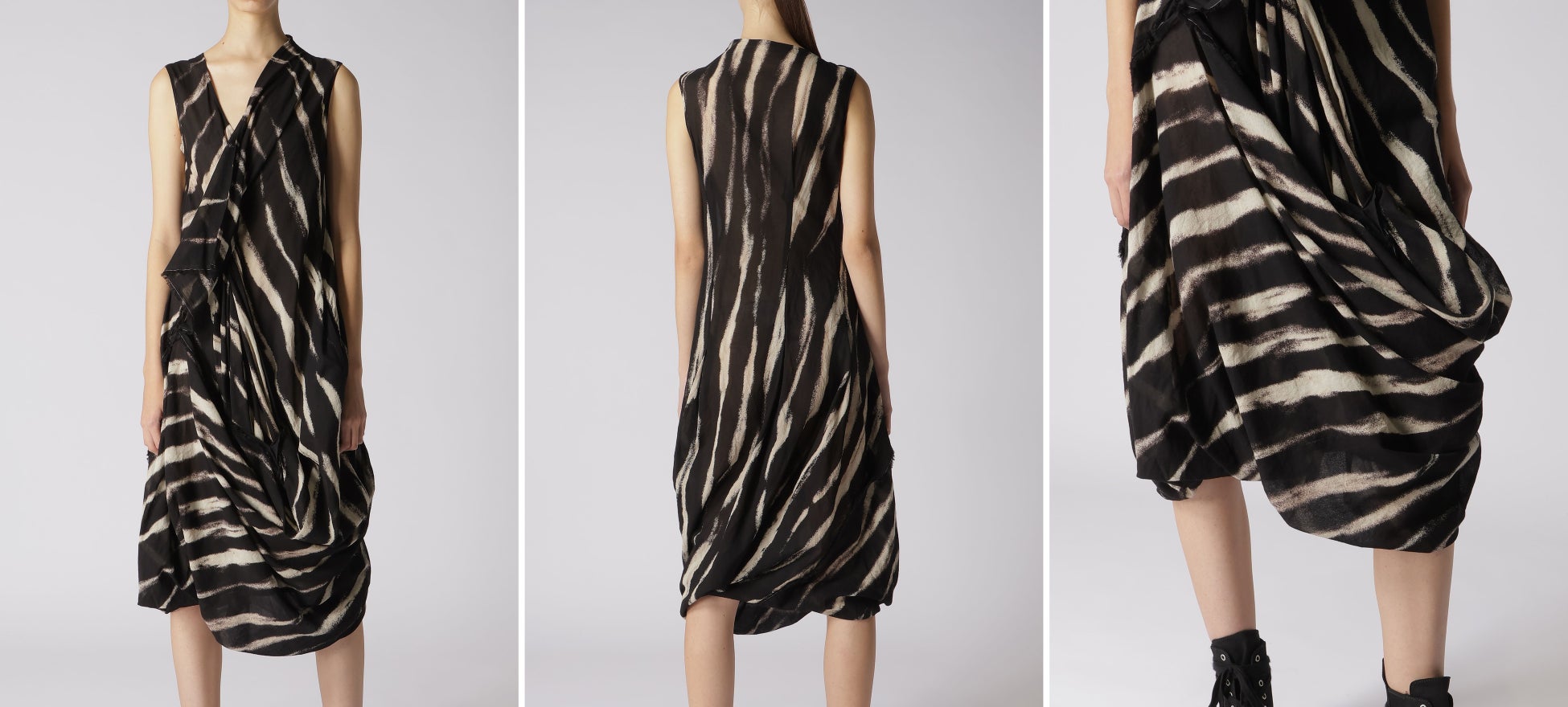 プリミティブなストライプを抜染プリントで表現、アシンメトリーなショールカラー、大きく膨らむ