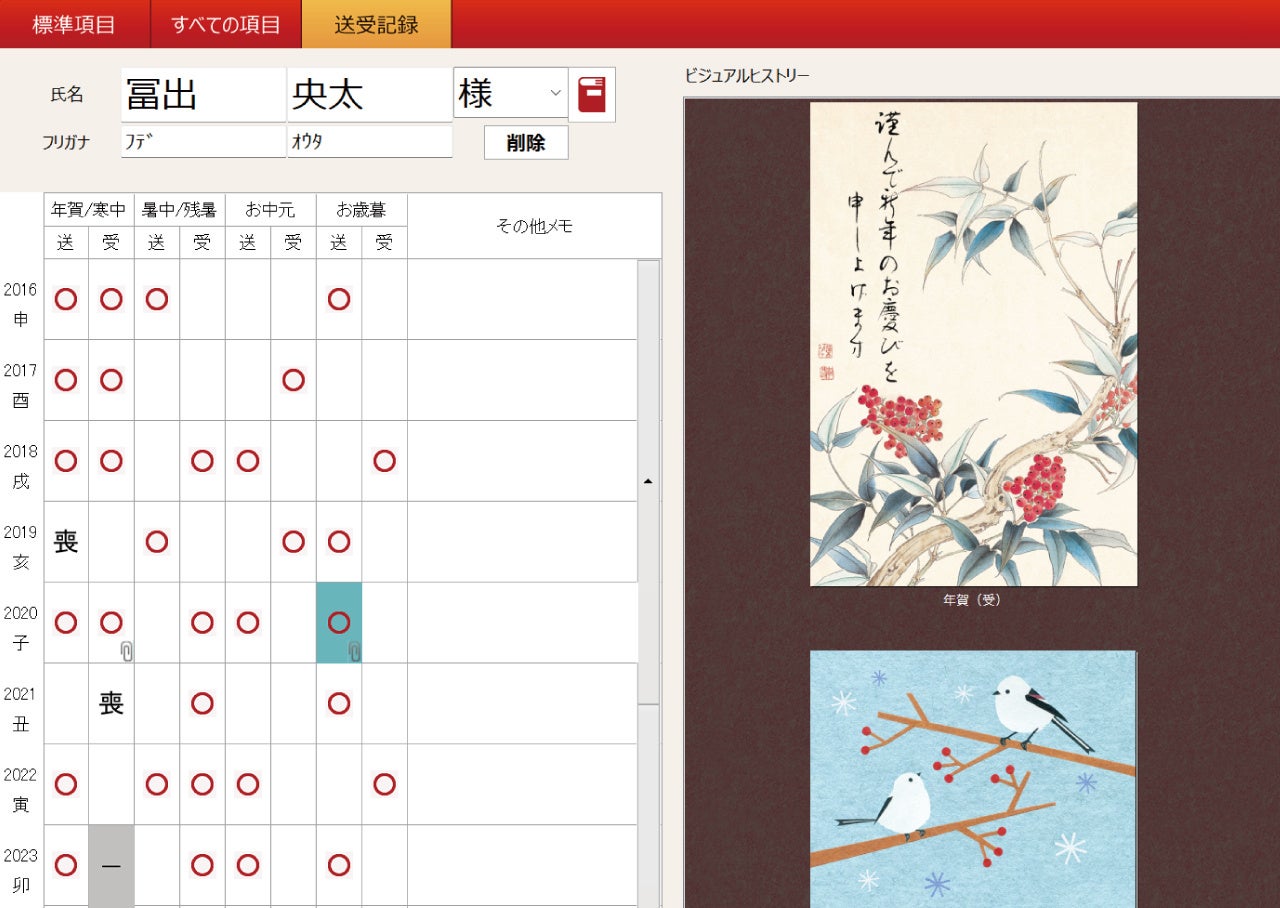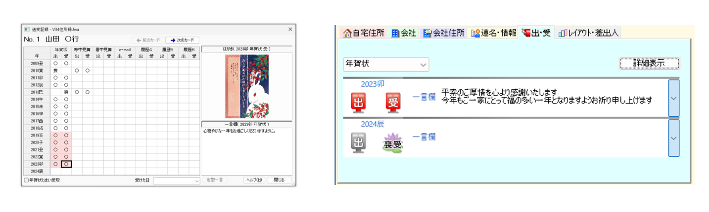 16年分が大きな画面で確認できる詳細表示と、2年分をすぐ確認できる画面と用途に合わせて使えるようになりました。さらに相手からきた「年賀状を辞めます」を記録できるようになり、年賀状を出す判断の1つとして活用できます。