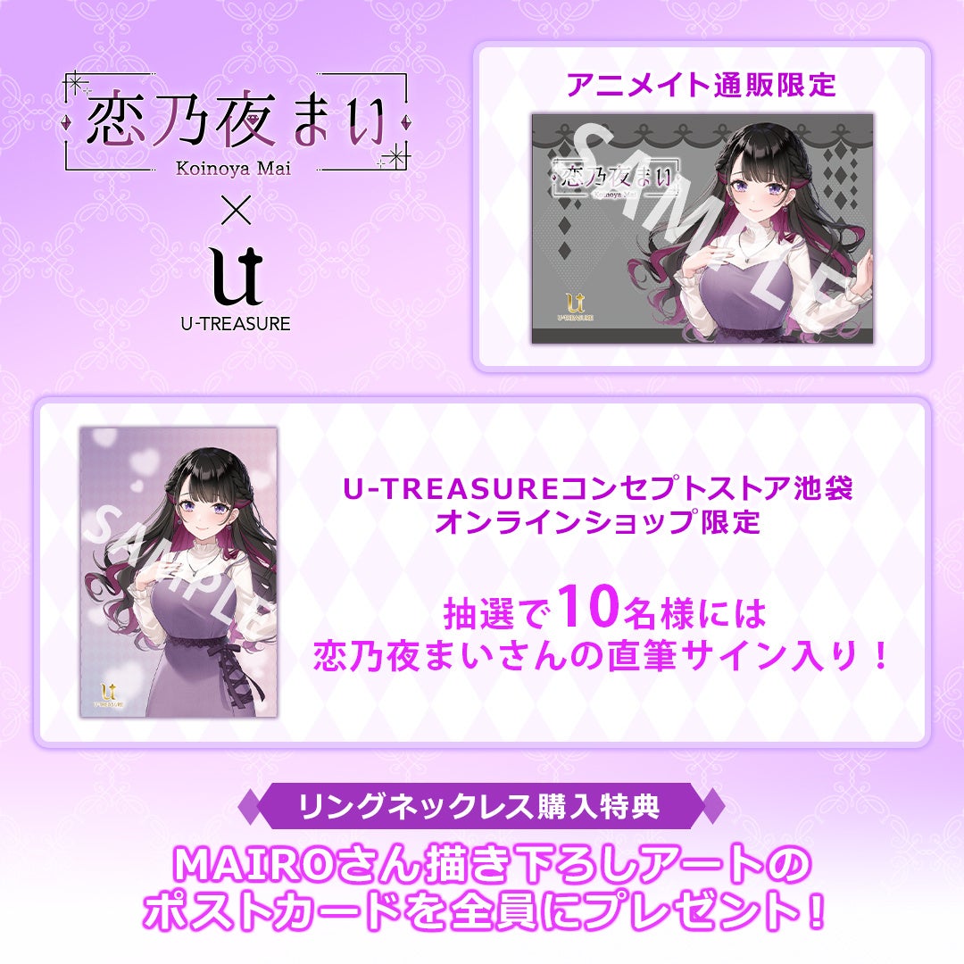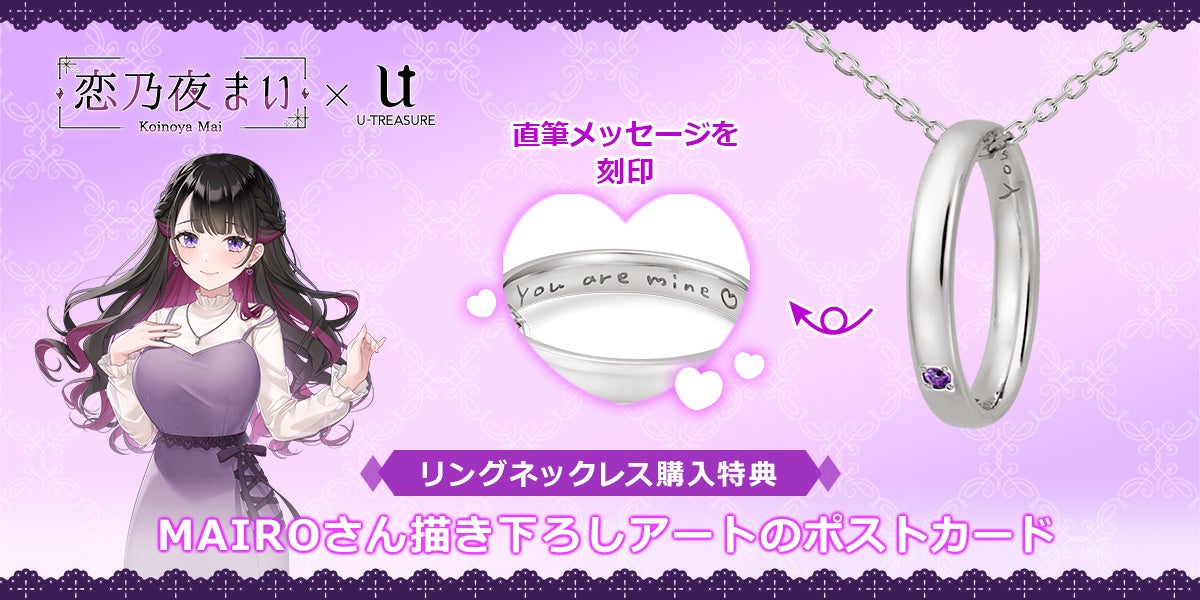このたびの新作は、プロプロプロダクション所属のVTuber『恋乃夜まい』からの直筆メッセージ「You are mine♡」のメッセージを刻印したリングネックレスです。リングネックレスを1点ご成約につき、描き下ろしアートを使用したポストカード(非売品)を1点プレゼントいたします。さらに「ユートレジャーコンセプトストア池袋・ユートレジャーオンラインショップ」で購入いただいた方の中から抽選で10名様には恋乃夜まいさんの直筆サイン入りとなっています。
