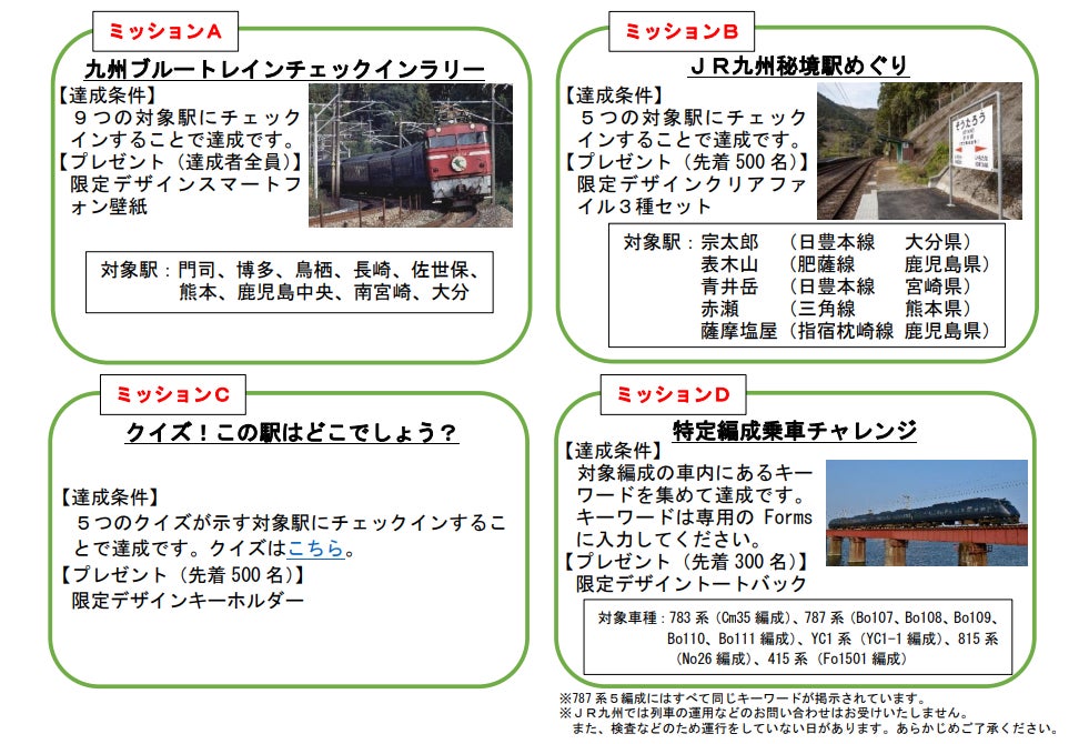 九州を巡る4つの鉄道に関するミッションを設定しました。それぞれのミッションを達成すると、