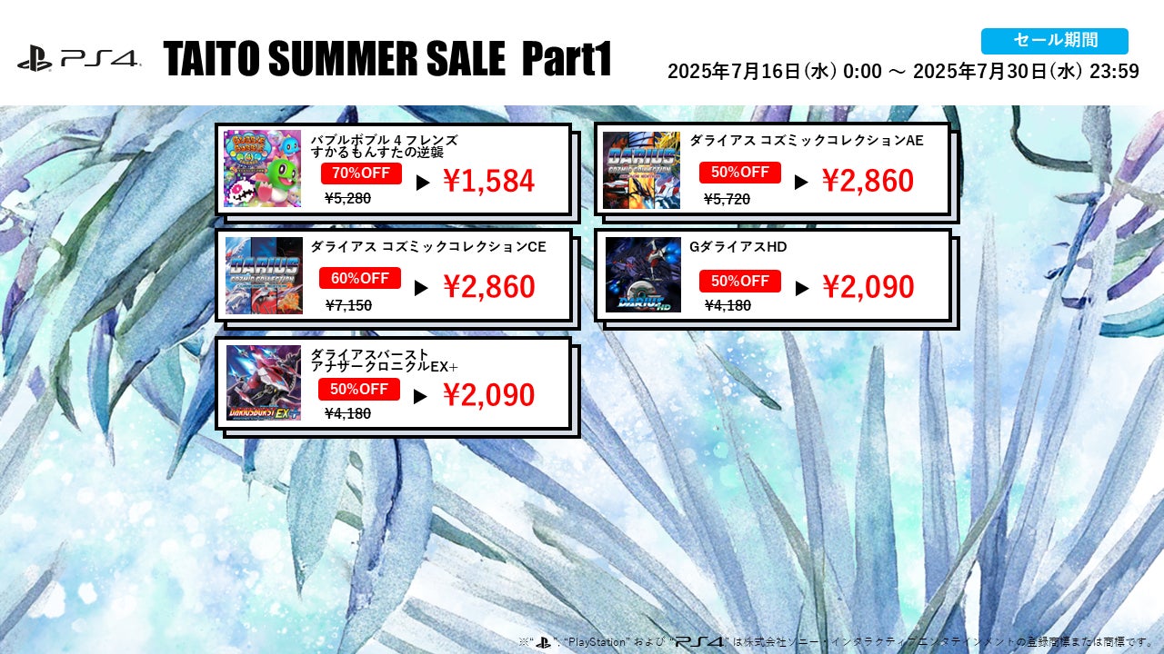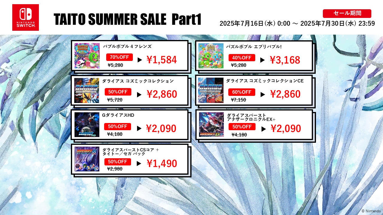 Part1のセール対象ソフトとして、今冬に最新作が発売予定の『バブルボブル』シリーズのアクションゲーム『バブルボブル 4 フレンズ』が初の70%OFFとなるほか、同シリーズ作品のバブルシューティングゲーム『パズルボブル エブリバブル!』が40%OFF、シューティングゲーム『ダライアス』シリーズが50%OFF以上となります。