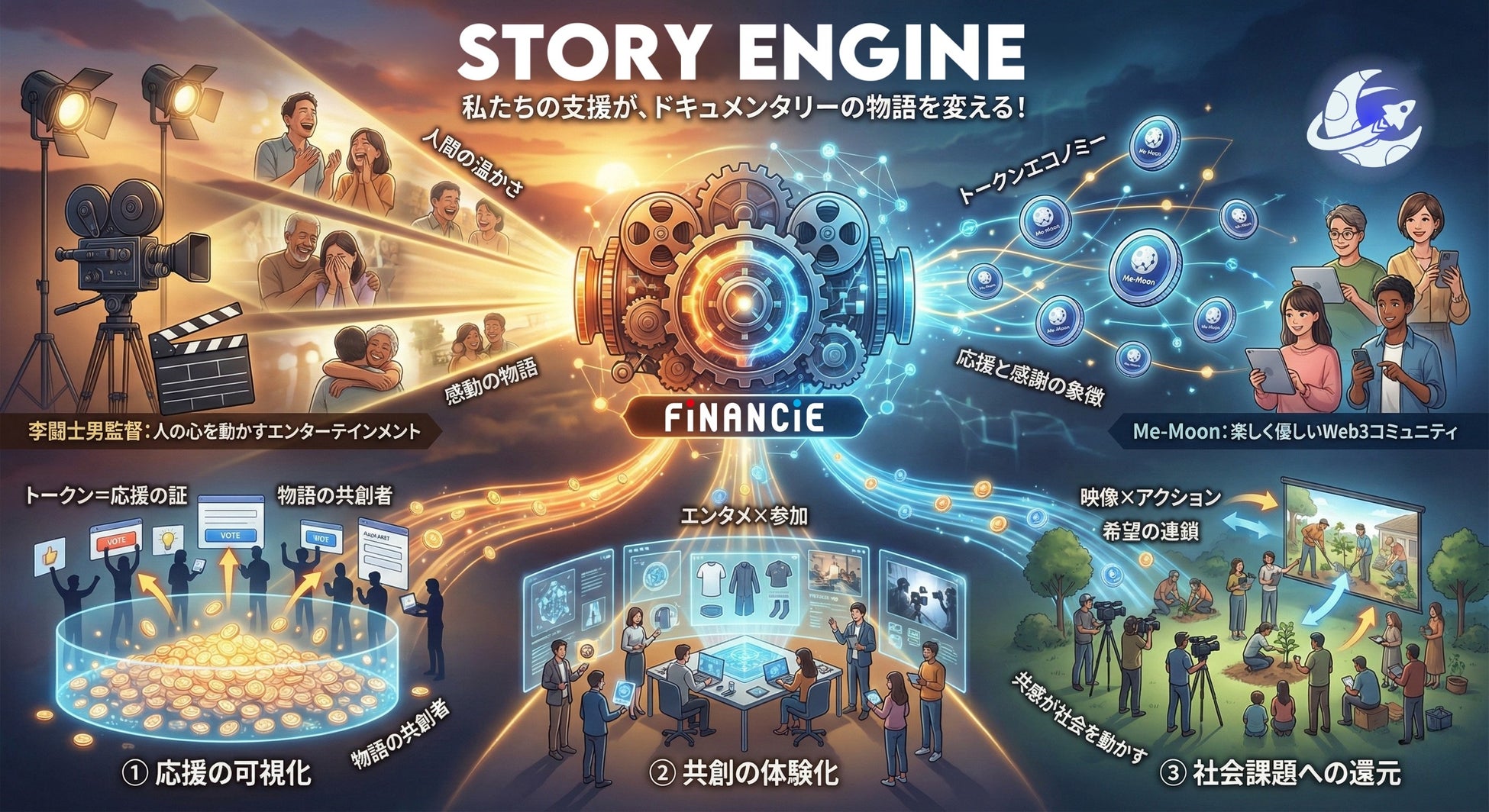 フォロワーを“動く仲間”に変えるトークン型SNS「FiNANCiE」を提供する株式会社フィナンシェ(本社:東京都渋谷区、代表取締役CEO 國光 宏尚)は、映画監督の李闘士男氏とWeb3コミュニティMe-Moon Guildが共同で推進する社会課題応援プロジェクト《STORY ENGINE》のコミュニティ開設に伴い、第1弾ファンディングを12月3日10:00より開始したことをお知らせいたします。
