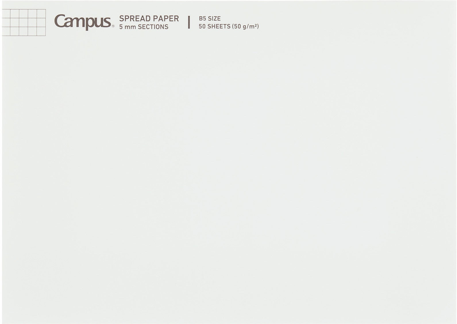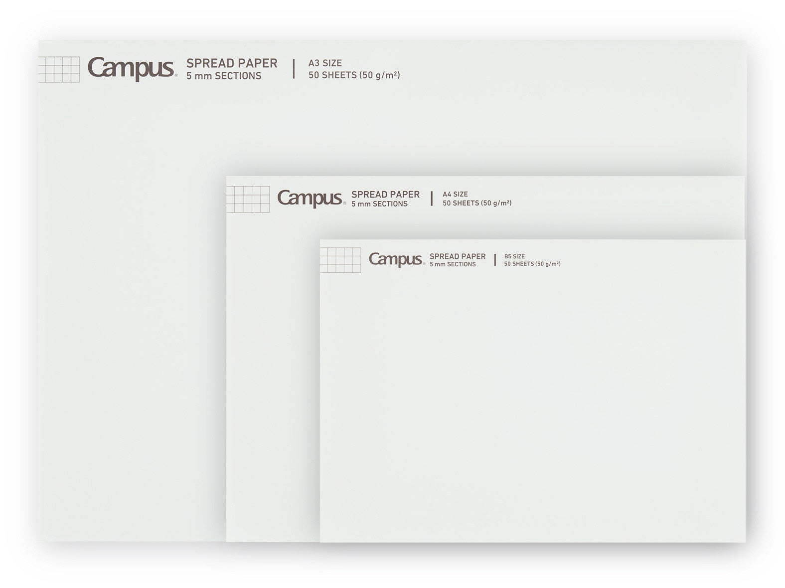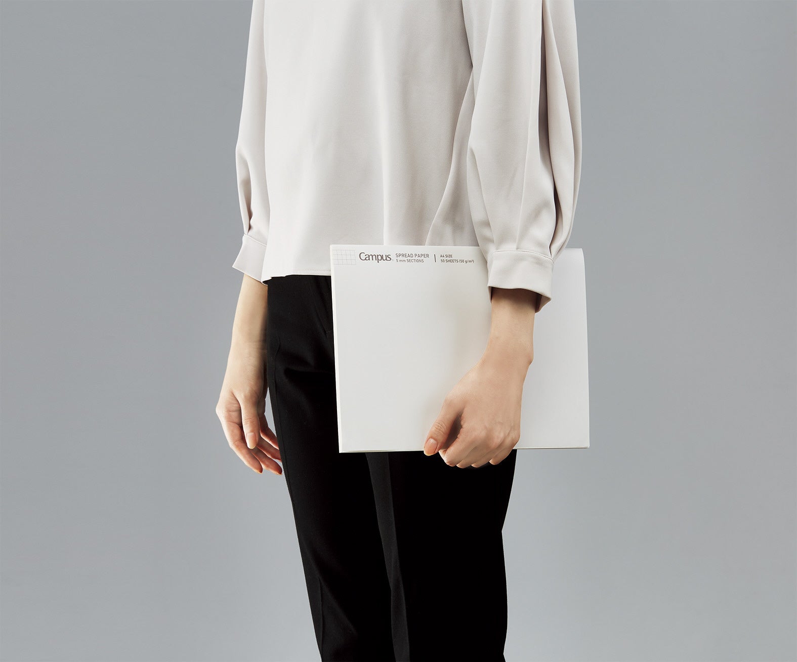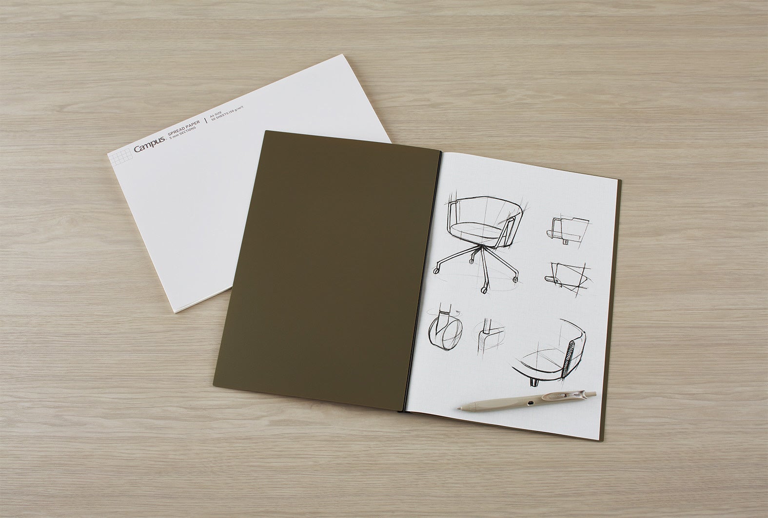 そこでコクヨは、思考のための筆記用紙として、今回発売する「キャンパス レポートパッド<SPREAD PAPER>」を新たに提案します。製本されているので、コピー用紙と比較しバラバラにならず、持ち運びがしやすくなっています。また、製本には表紙を折り返しても浮きが少ない方法を用いているため、使用時には紙をそのまま束ねたかのようなスッキリとした状態になり、思考のツールに適した無駄のない佇まいを実現しています。罫線はタテヨコの向きを問わない5mm方眼罫で、中紙には速乾性が高く、かつコピー用紙よりも薄く携帯性に優れたコクヨオリジナルの書翰箋原紙を採用しました。