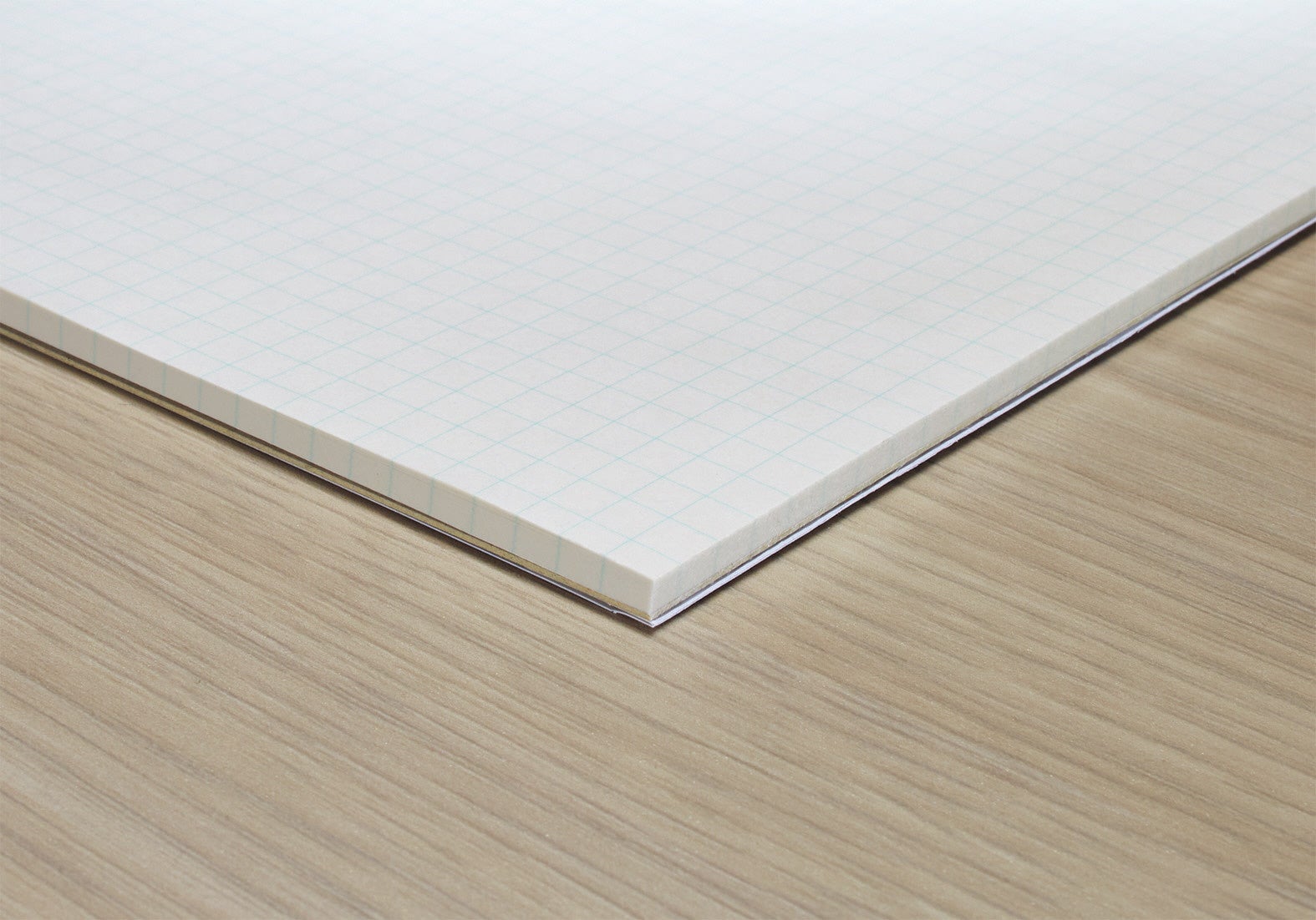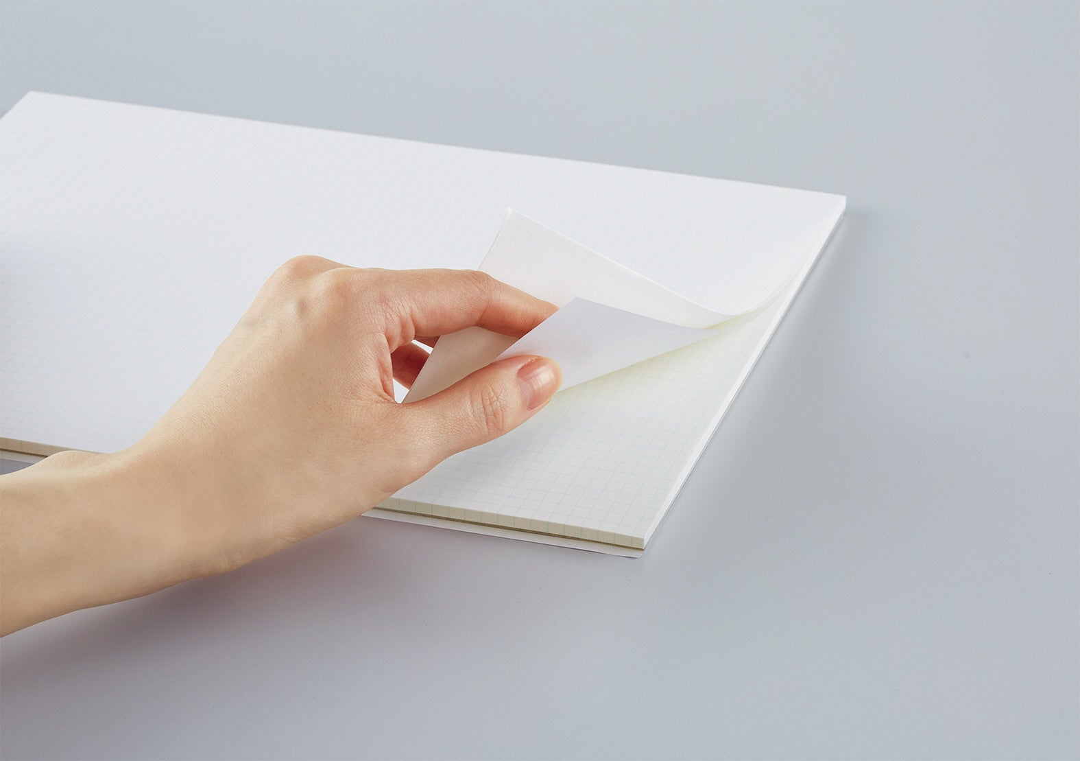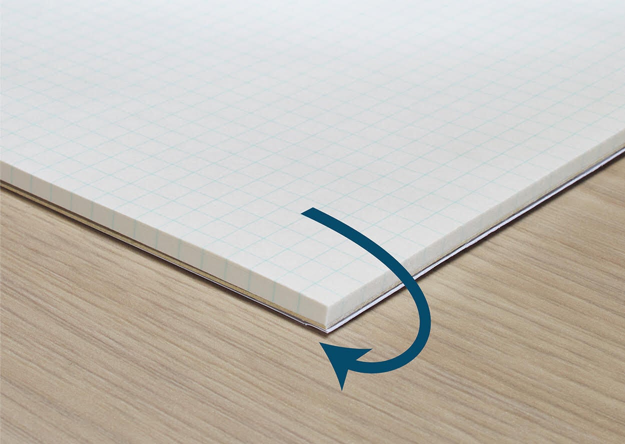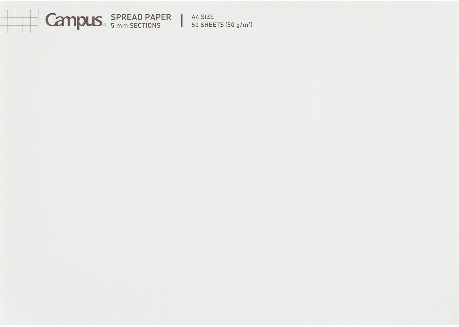 そこでコクヨは、思考のための筆記用紙として、今回発売する「キャンパス レポートパッド<SPREAD PAPER>」を新たに提案します。製本されているので、コピー用紙と比較しバラバラにならず、持ち運びがしやすくなっています。また、製本には表紙を折り返しても浮きが少ない方法を用いているため、使用時には紙をそのまま束ねたかのようなスッキリとした状態になり、思考のツールに適した無駄のない佇まいを実現しています。罫線はタテヨコの向きを問わない5mm方眼罫で、中紙には速乾性が高く、かつコピー用紙よりも薄く携帯性に優れたコクヨオリジナルの書翰箋原紙を採用しました。