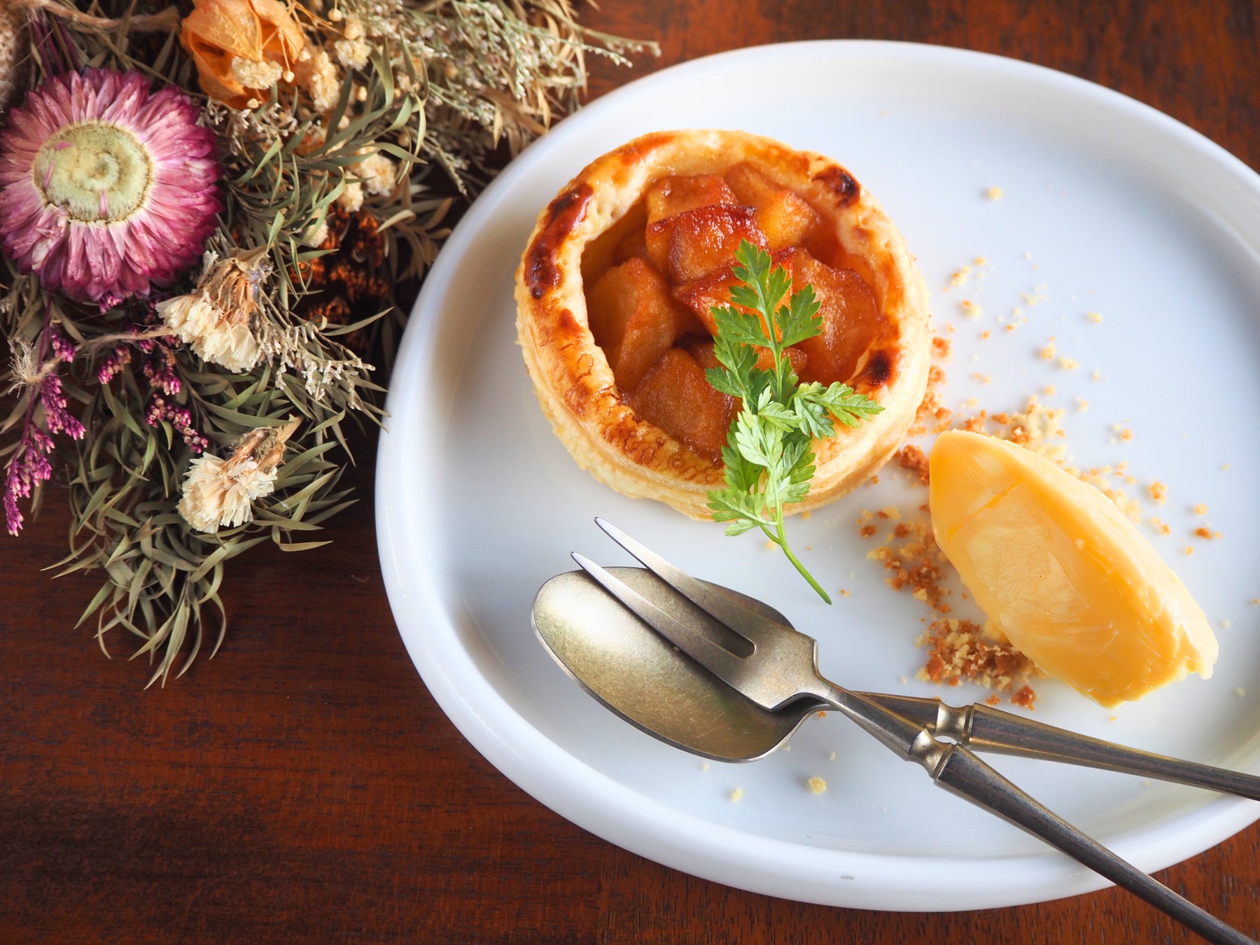 別皿でお届けする「アップルパイとキャラメルアイス」はリンゴが見えるオープンスタイルで。