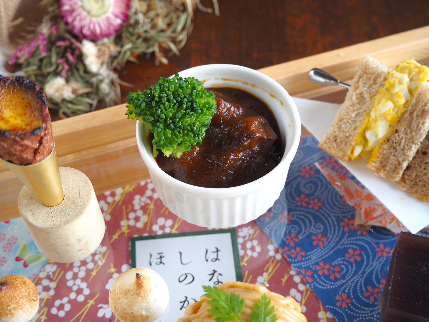 セイボリーには、じっくり煮込んだほろほろ肉と深みのある味わいが楽しめる「牛タンのビーフシチュー」や、濃厚なかぼちゃの味わいに生ハムの塩味がアクセントになった「生ハムとかぼちゃのコロッケ」などをご用意。「さつまいもスコーン」は、割った瞬間にさつまいもの芳ばしい香りがふんわりと香り食欲をそそります。