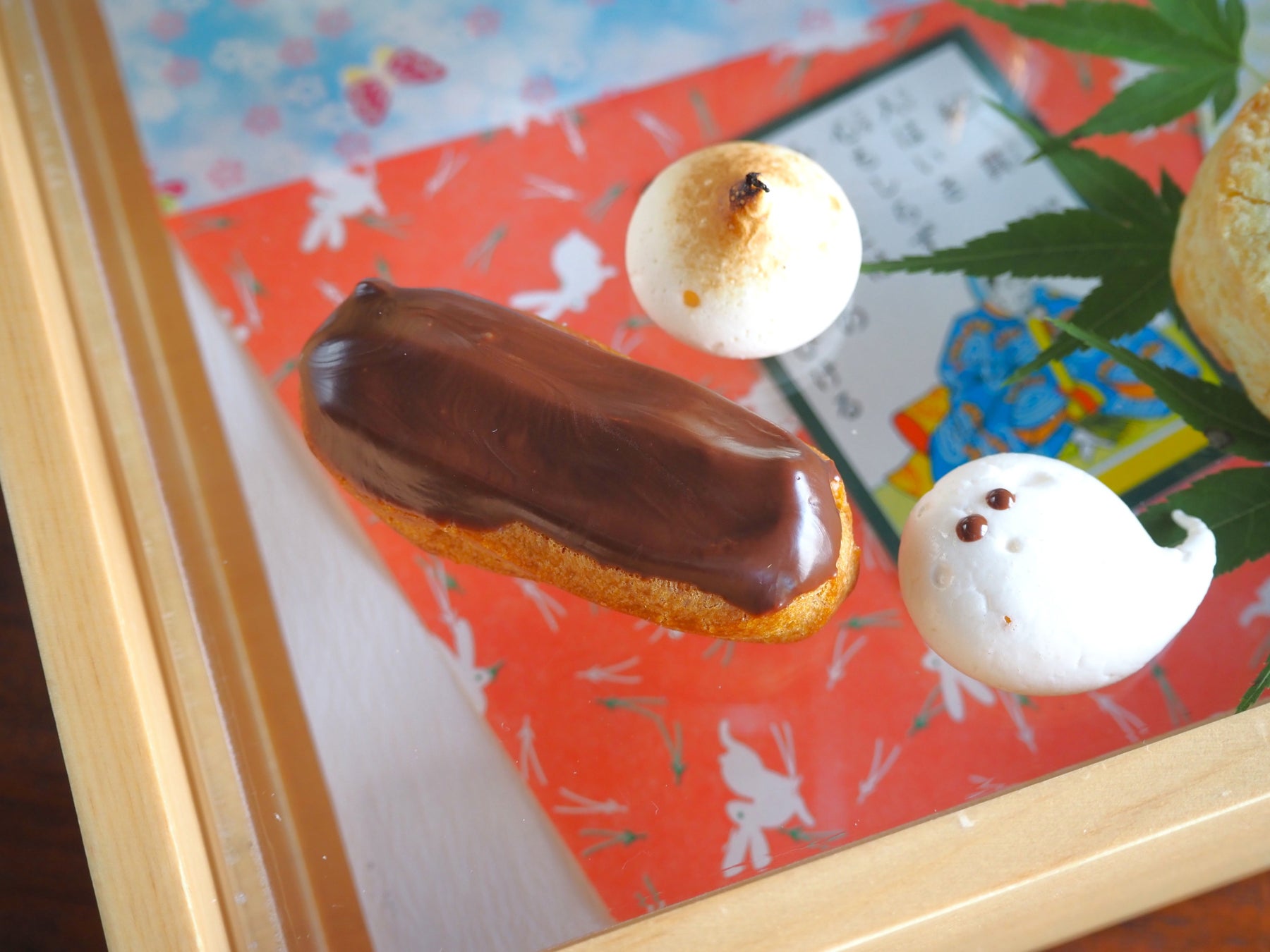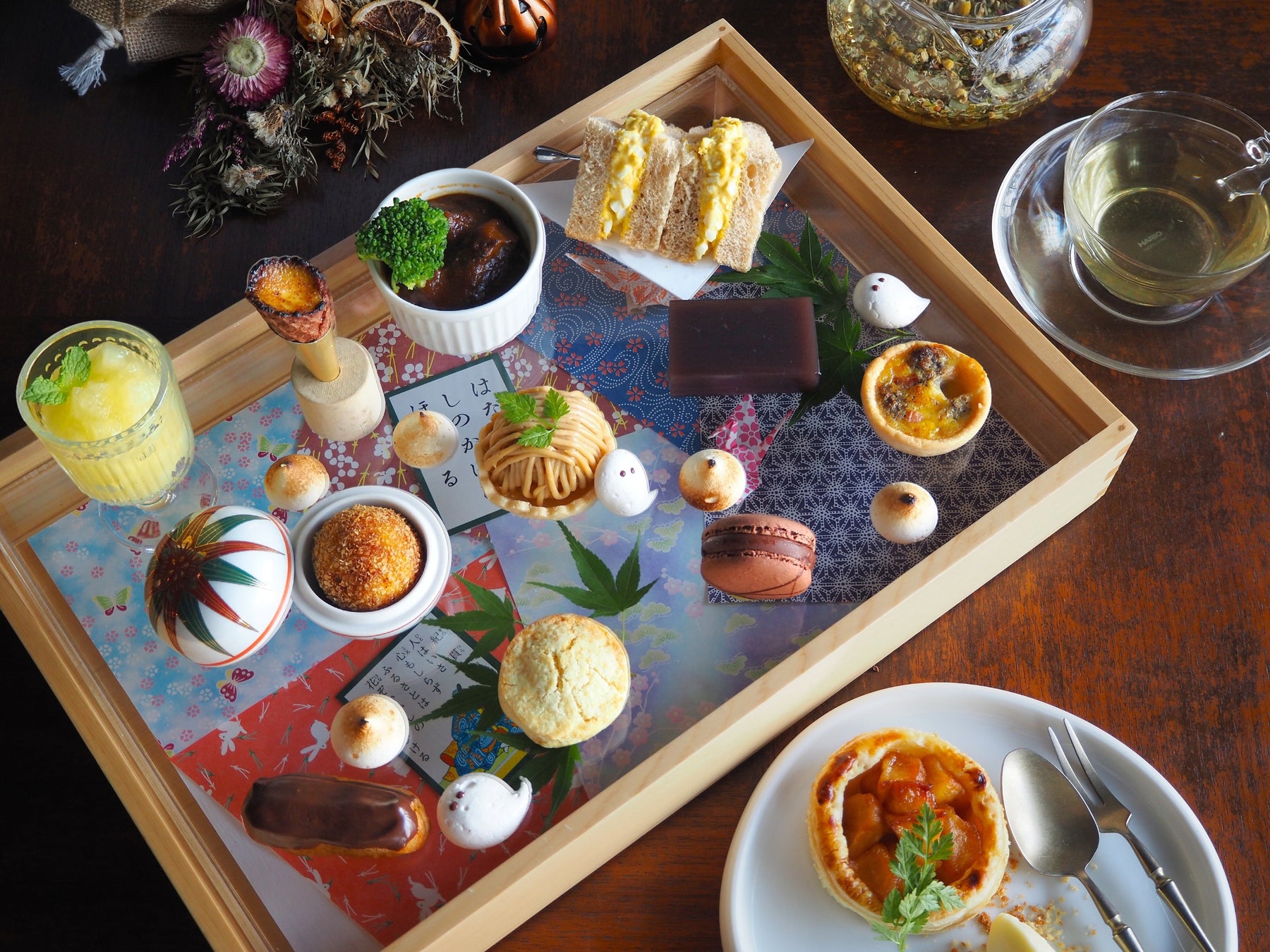 温かみのある木箱のティースタンドは、ホテルのデザインコンセプトでもある「平安京」を思わせる百人一首や千代紙をちりばめた雅なスタイルに。ハロウィーンに欠かせないお化けたちもティースタンドに登場し、一層ユニークで華やかなティーセットをお楽しみください。