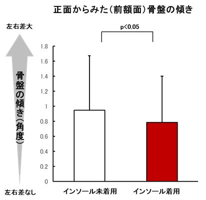 その結果、インソール未着用時には骨盤角度が平均して0.95°左右いずれかに傾いていましたが、着用後には0.22°の傾きの改善が認められました(図3)。以上から、インソールを着用することで、身体アライメントのゆがみを補整できる可能性があると考えられます。